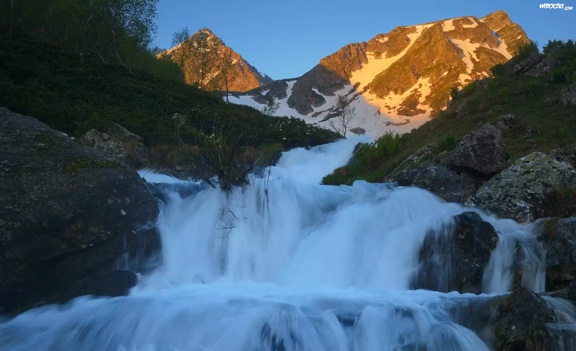 Zdjęcia, Góry, Rzeka, Kaskada, Skały, Rośliny