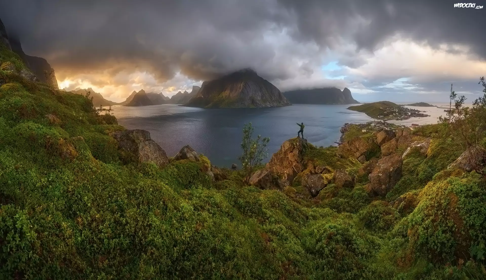 Góry, Góra Higravstinden, Skały, Morze Norweskie, Chmury, Drzewa, Człowiek, Wyspa Moskenesoya, Lofoty, Norwegia |