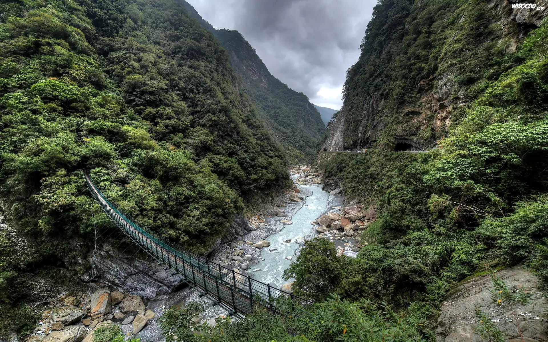Zdjęcia, Góry, Las, Rzeka, Skały, Most