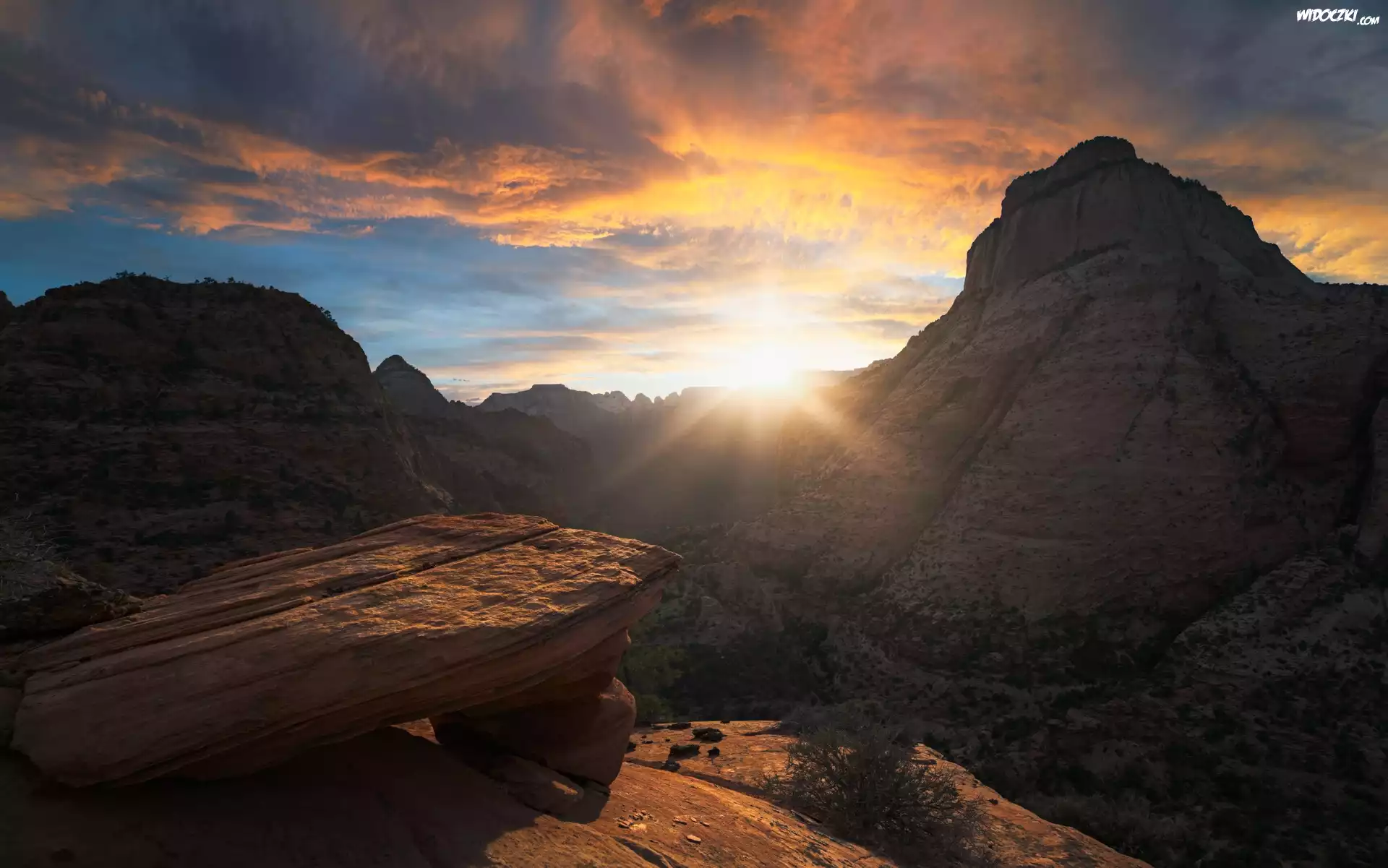 Zdjęcia, Stany Zjednoczone, Utah, Park Narodowy Zion, Góry, Skały, Drzewa, Zachód słońca