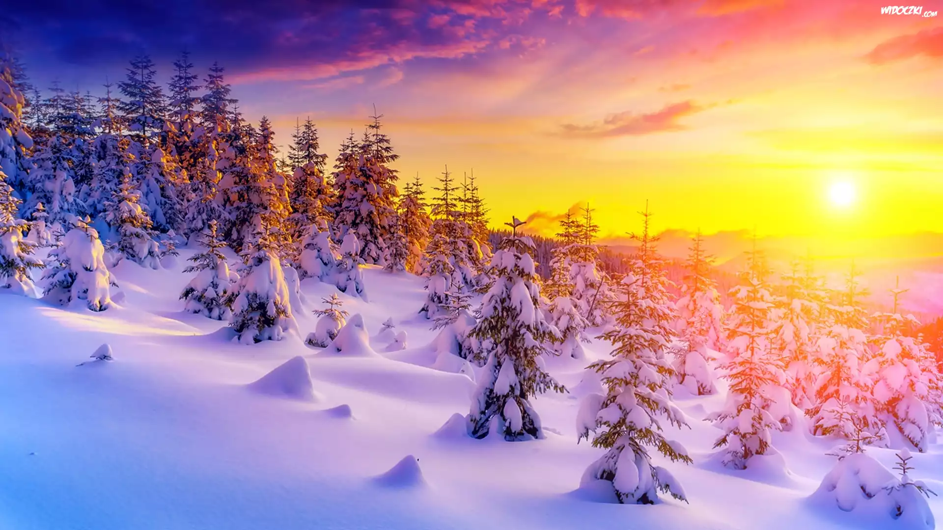 Góry, Drzewa, Chmury, Wschód słońca, Zima