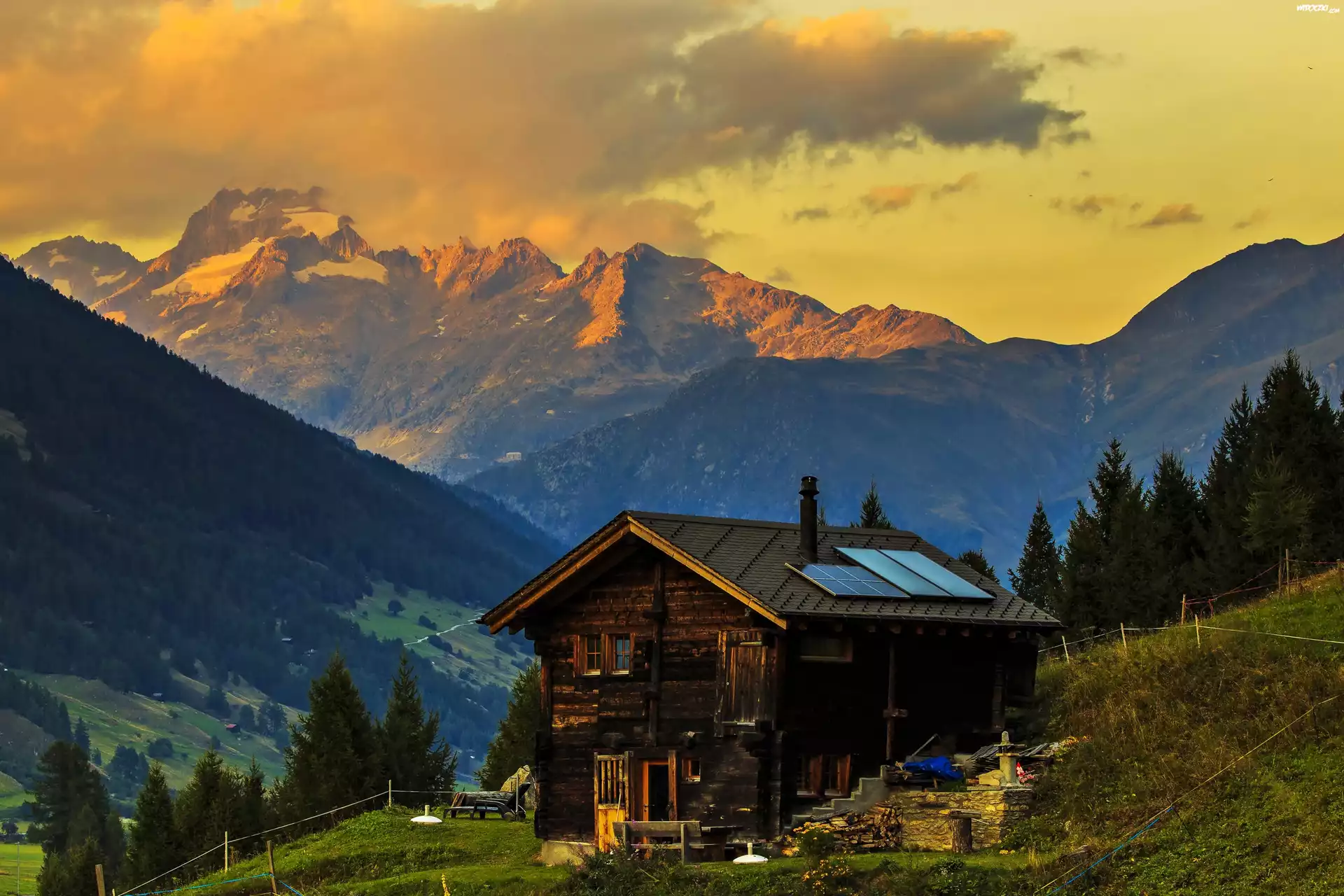 Zdjęcia, Góry, Dolina, Chmury, Zachód, Słońca, Dom