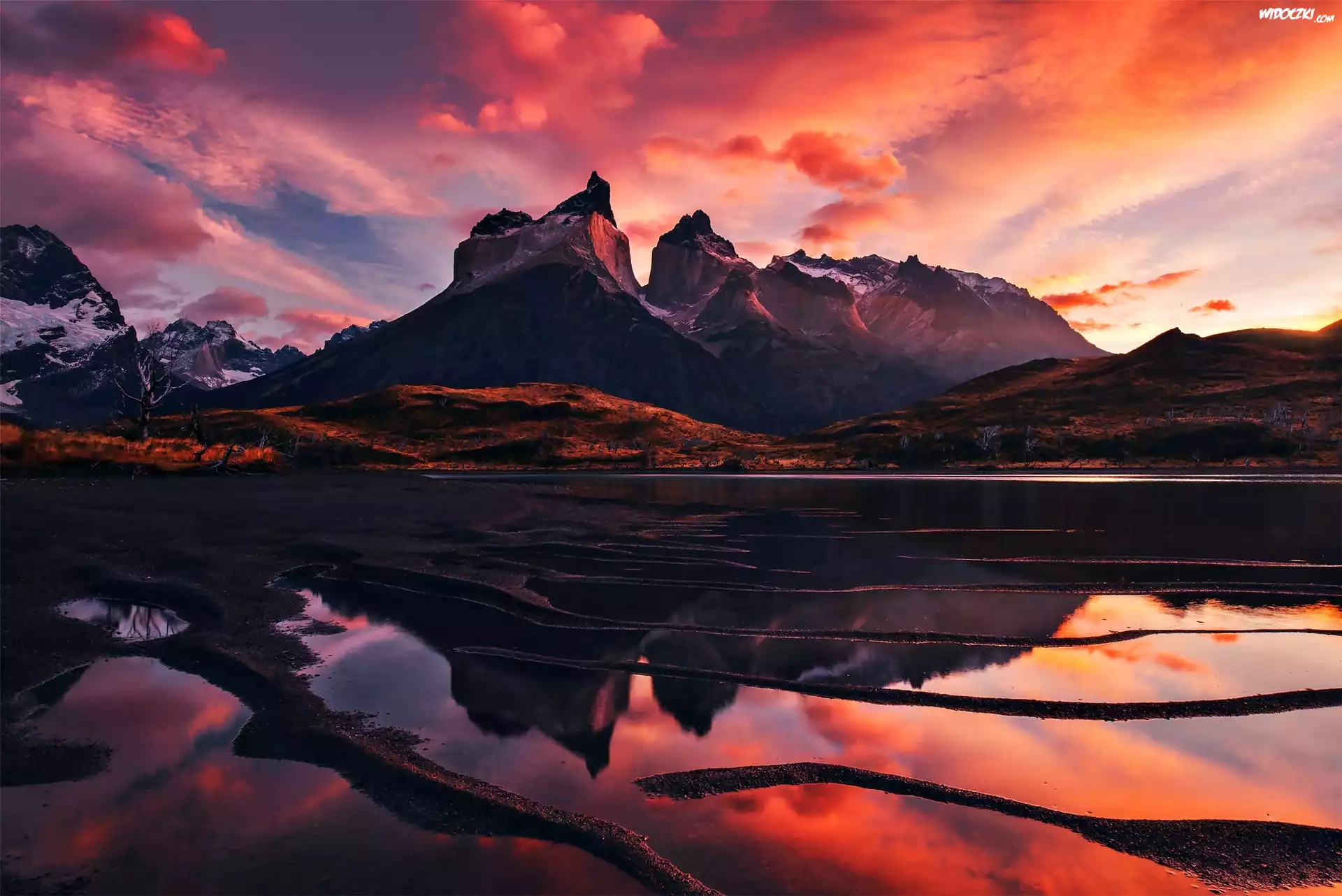 Góry, Jezioro, Chmury, Zachód, Słońca, Patagonia