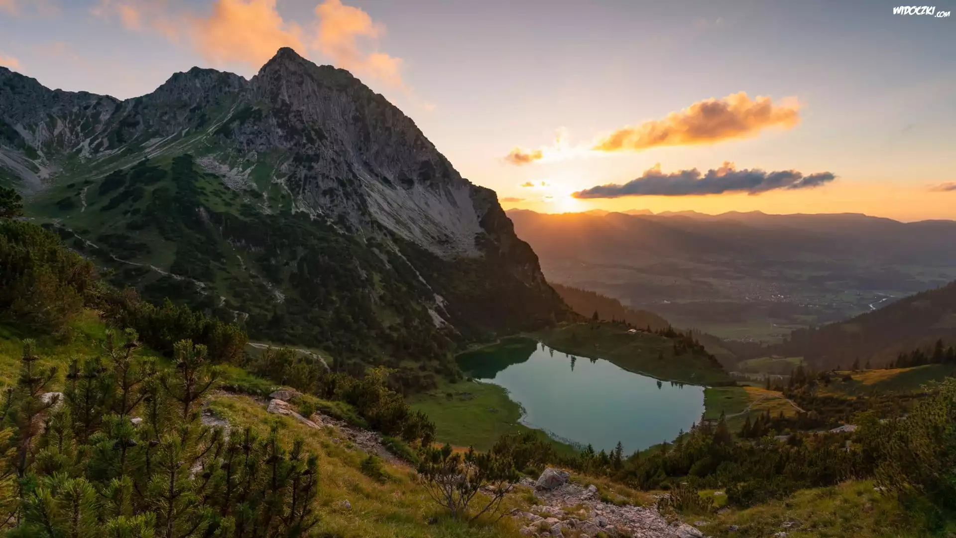 Góry, Jezioro, Drzewa, Wschód słońca, Chmury