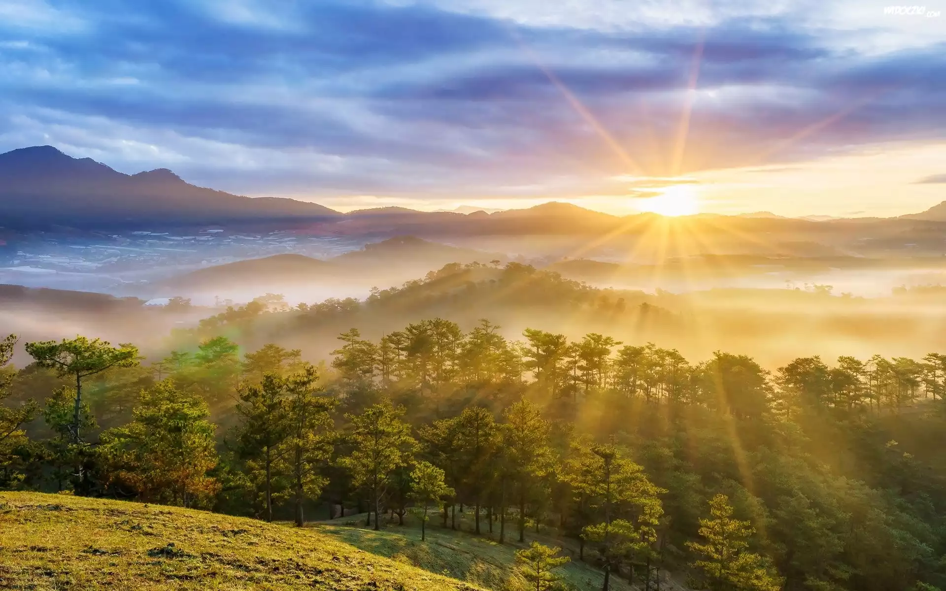 Zdjęcia, Góry, Drzewa, Promienie słońca, Mgła