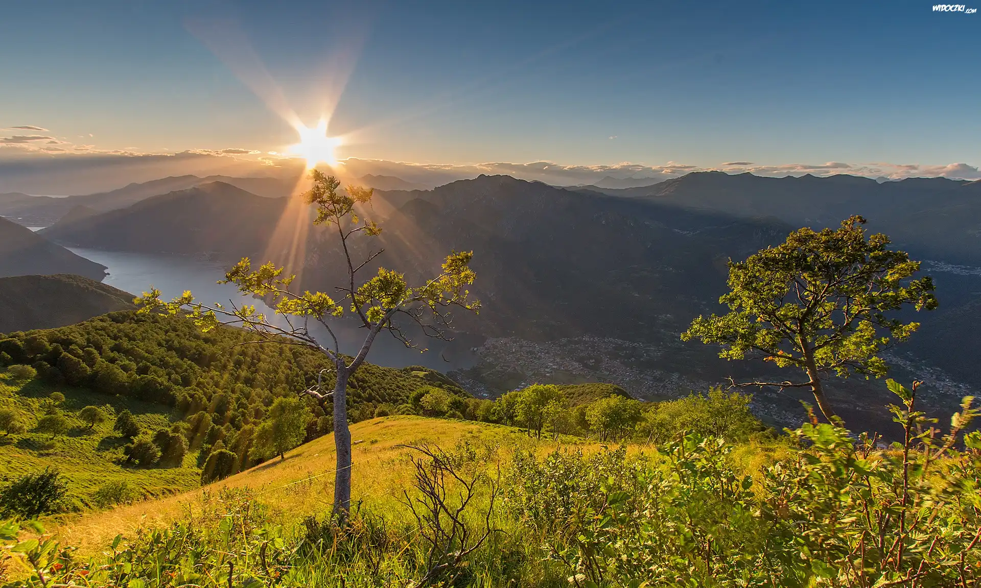 Zdjęcia, Góry, Jezioro, Promienie słońca, Drzewa