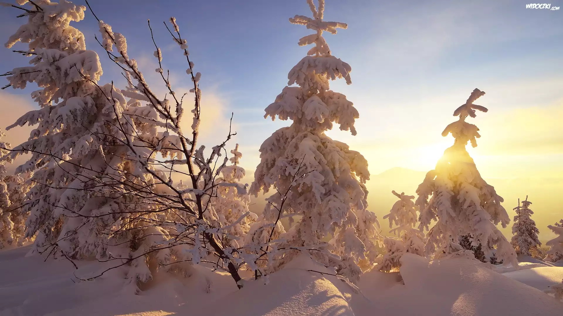 Zdjęcia, Ukraina, Góry Karpaty, Zima, Ośnieżone, Świerki, Zachód słońca