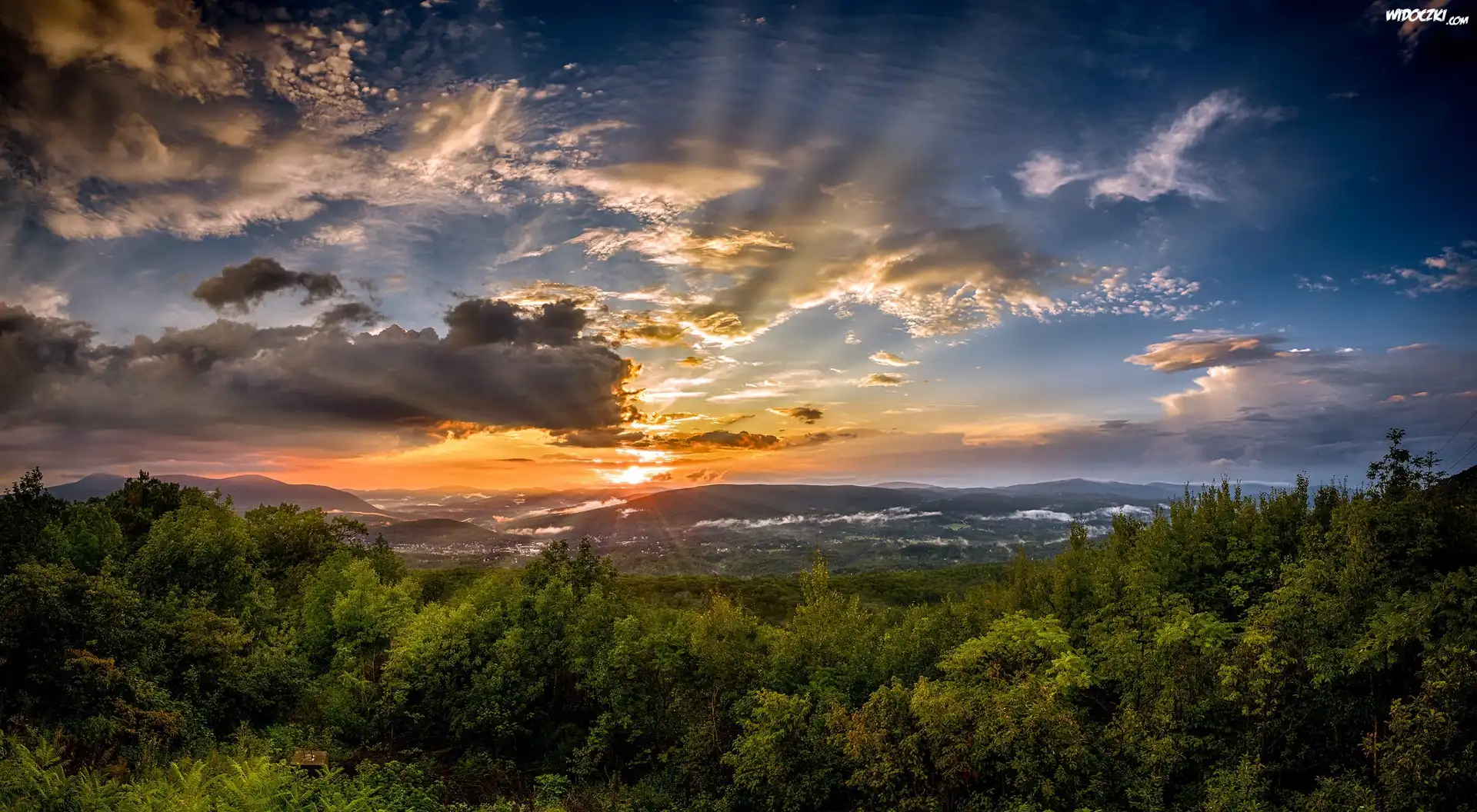 Zdjęcia, Góry, Drzewa, Wschód słońca, Chmury