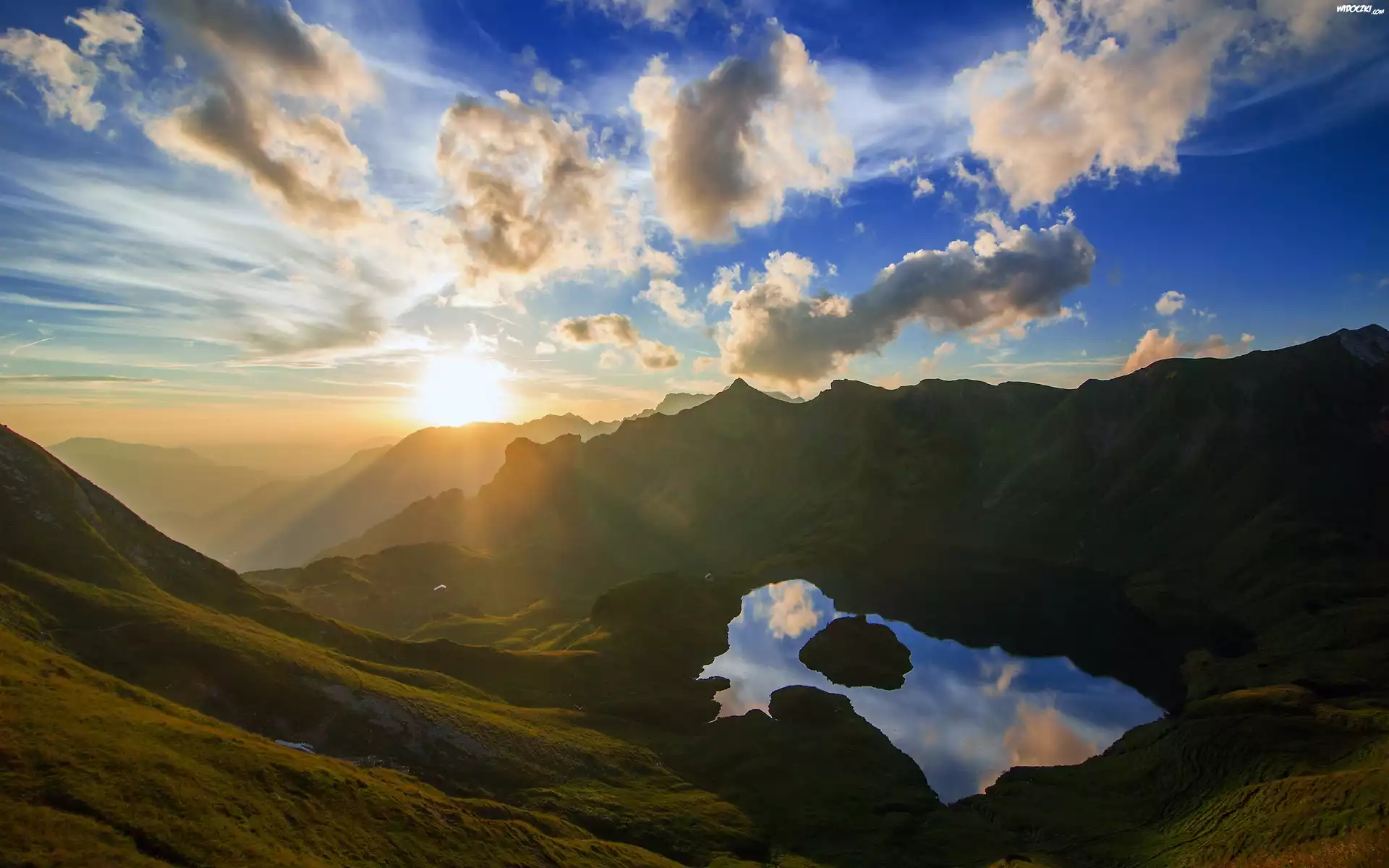 Zdjęcia, Góry, Jezioro, Wschód słońca, Chmury