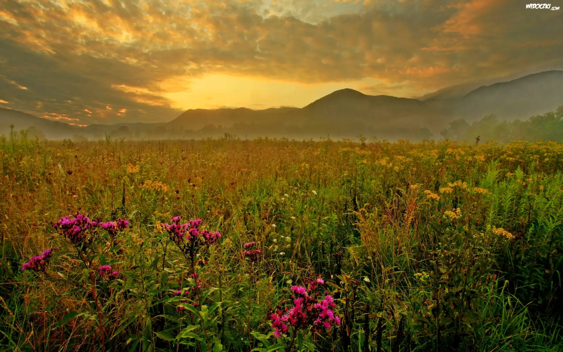 Zdjęcia, Góry, Łąka, Zachód, Słońca, Kwiatki