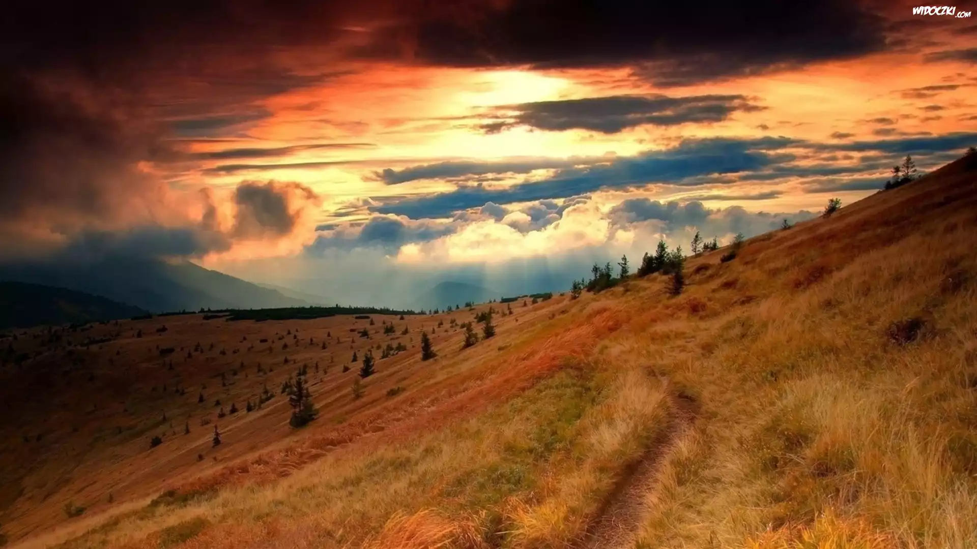 Zdjęcia, Góry, Doliny, Zachód, Słońca, Chmury