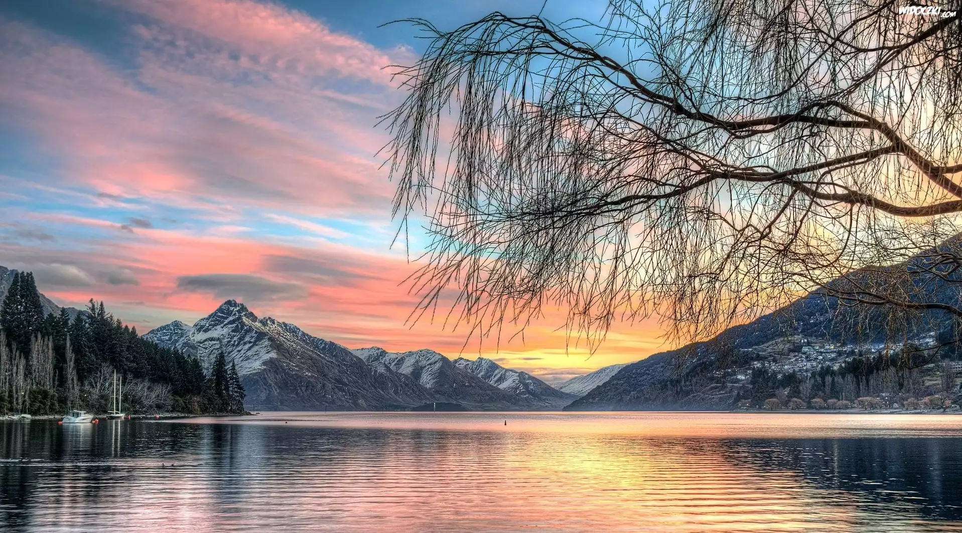 Góry, Jezioro, Zachód, Słońca, Drzewa