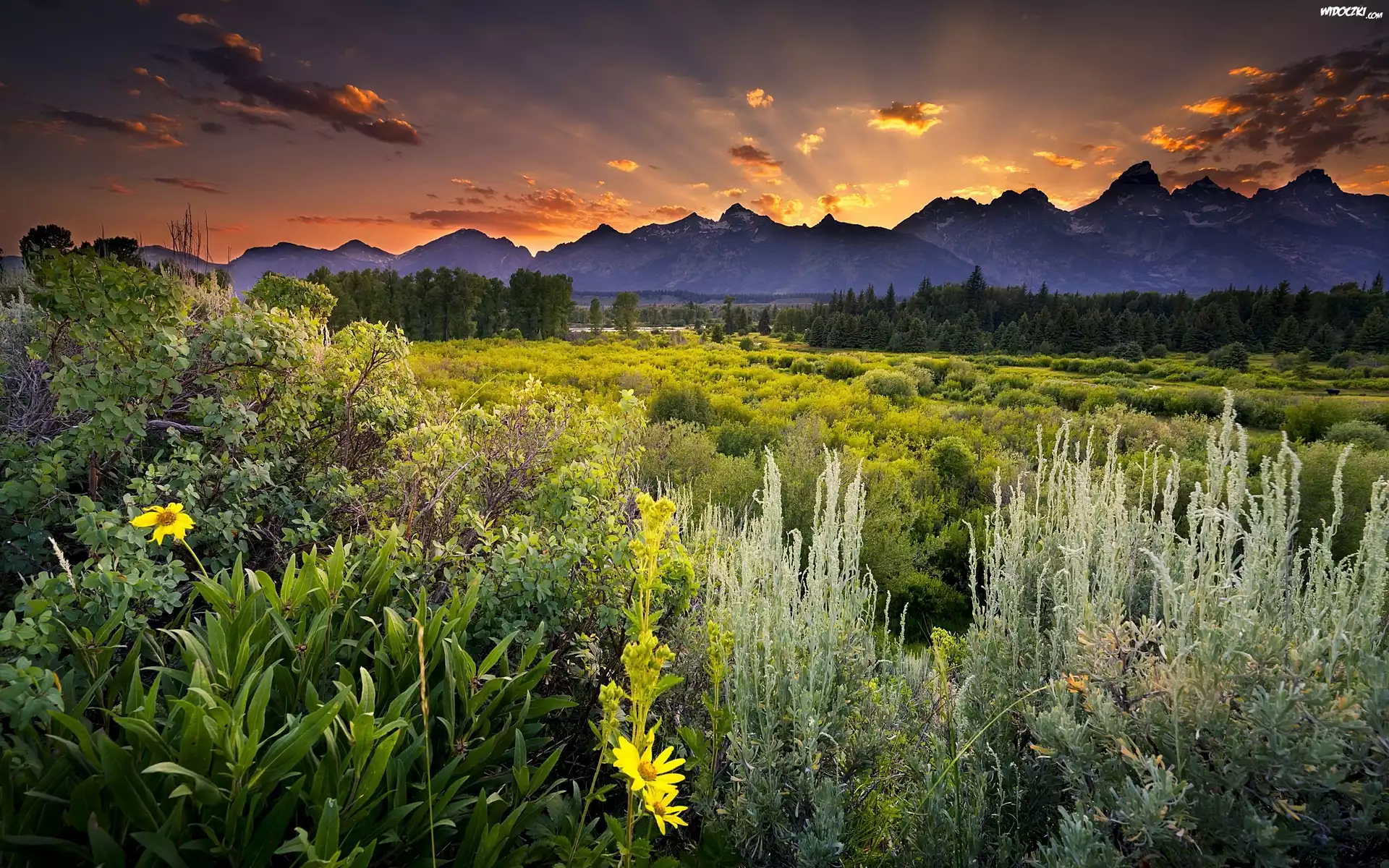 Góry, Lasy, Zachód, Słońca, Roślinność