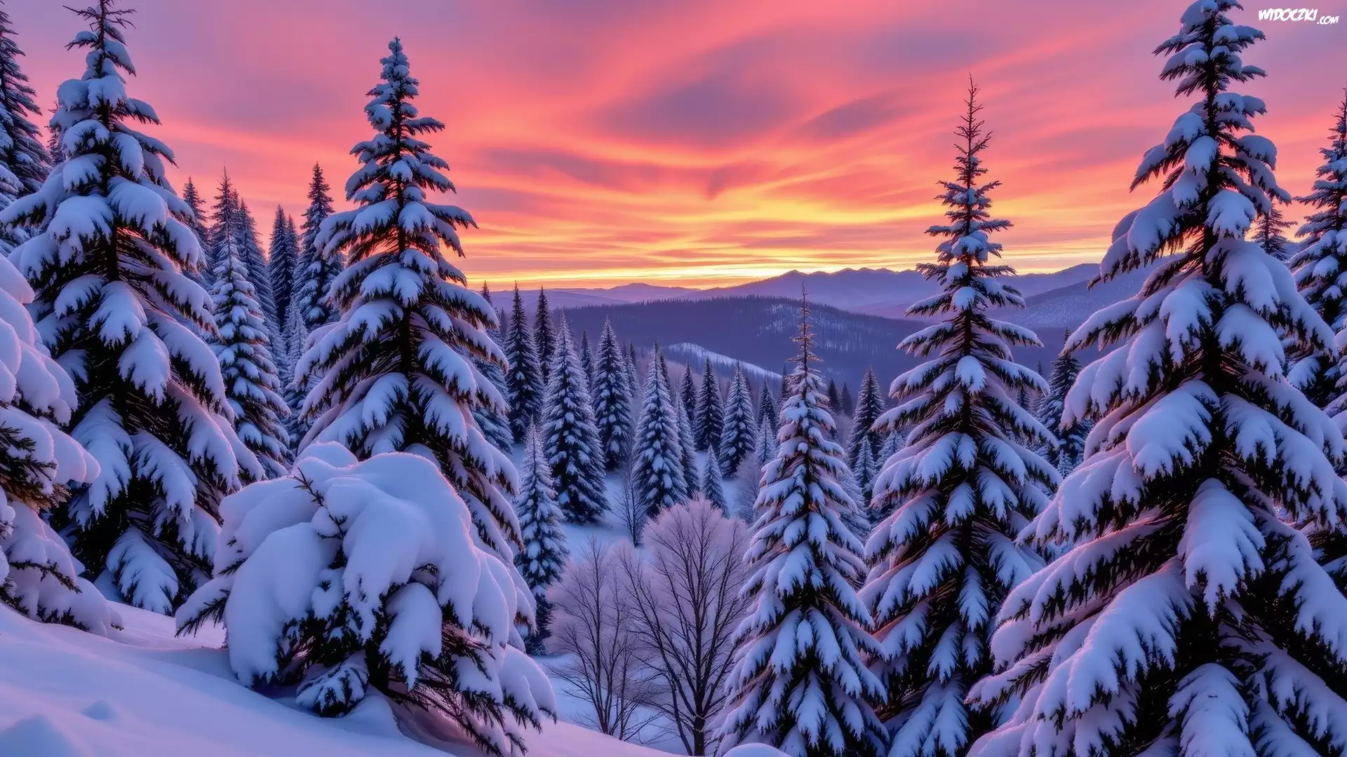 Zdjęcia, Zima, Zachód słońca, Kolorowe, Niebo, Ośnieżone, Drzewa, Góry