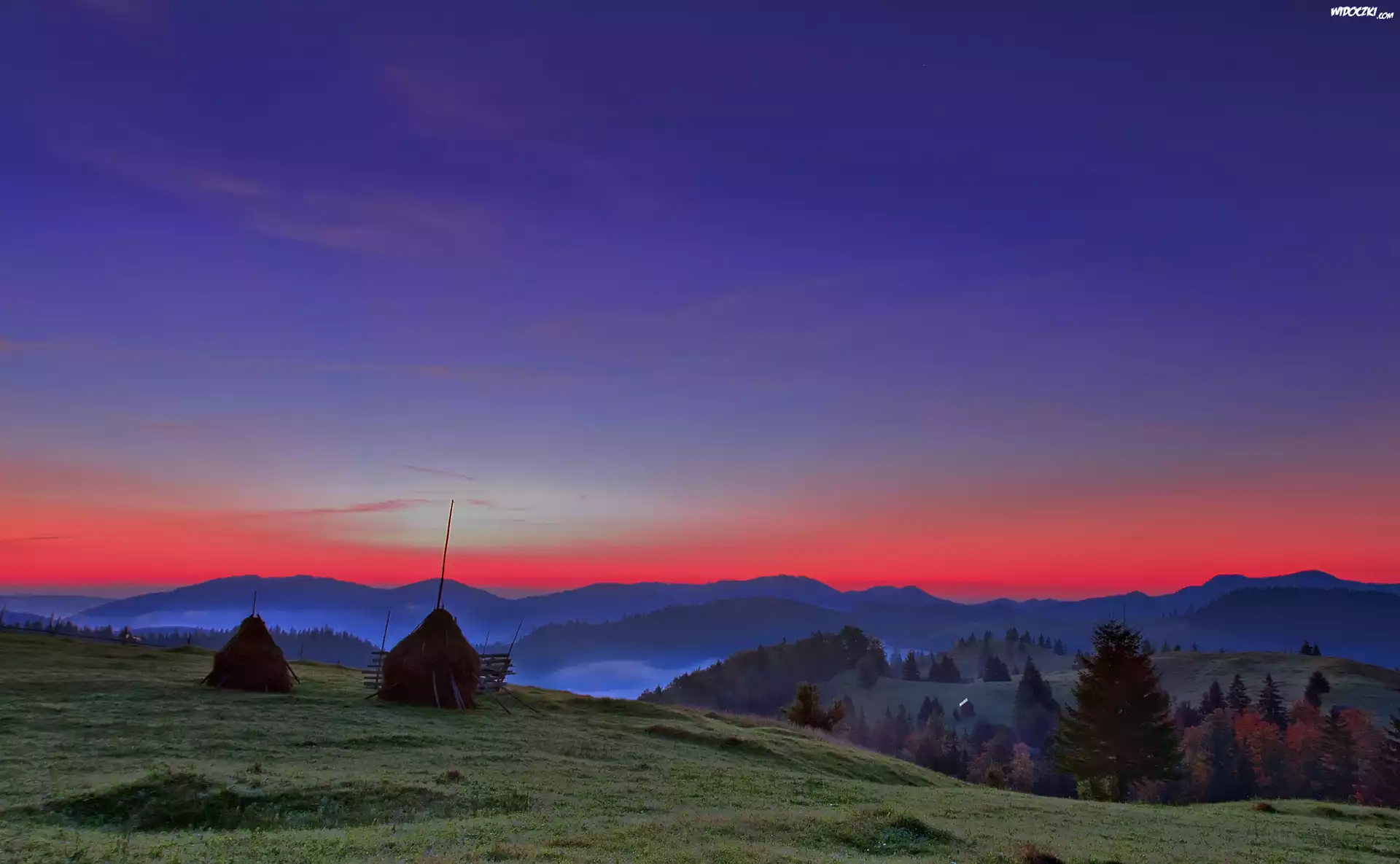 Zdjęcia, Góry, Pole, Zachód, Słońca, Drzewa