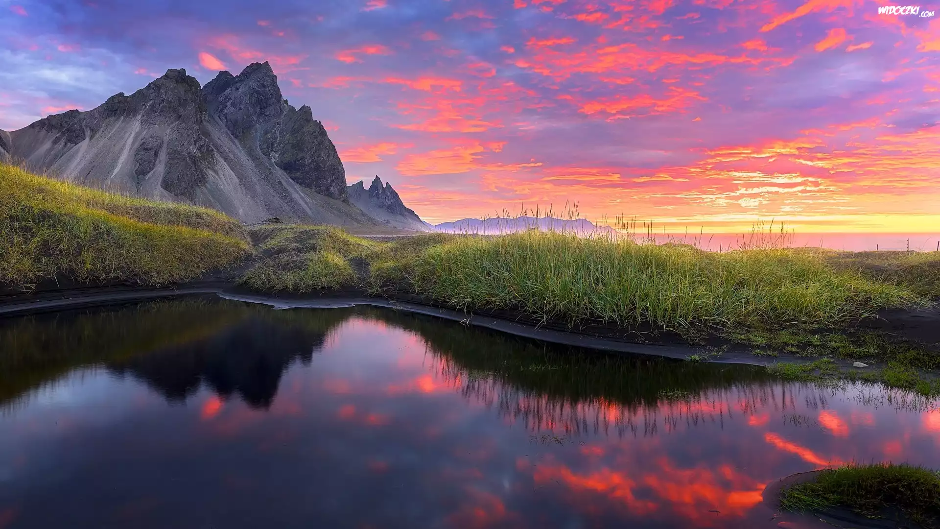 Góry, Vestrahorn, Kałuża, Różowe, Niebo, Zachód słońca, Trawa, Islandia