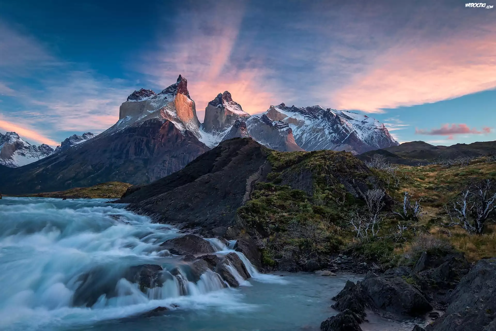 Chile, Góry Torres del Paine, Zachód, Słońca, Rzeka