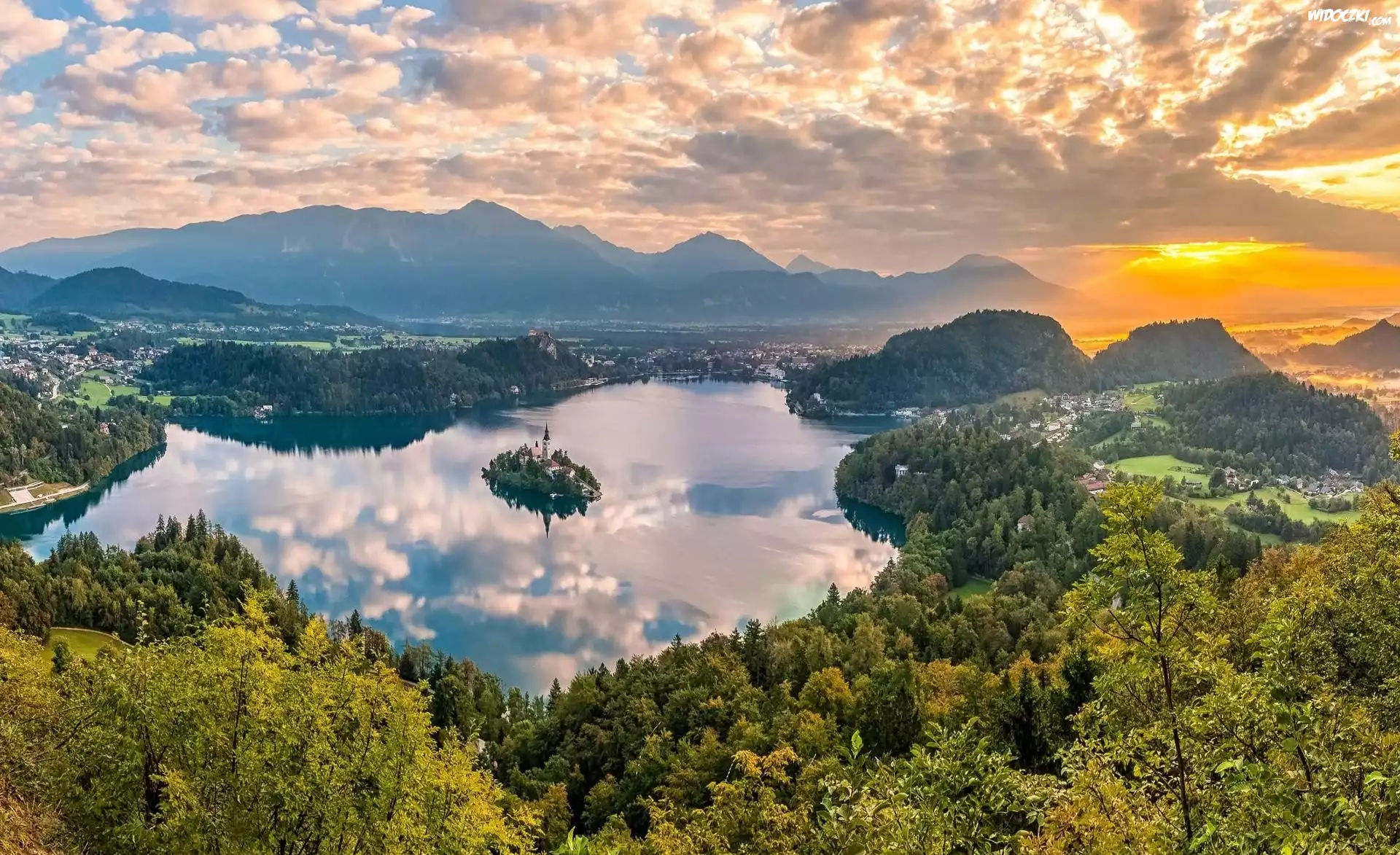 Zdjęcia, Słowenia, Wyspa Blejski Otok, Góry Alpy Julijskie, Jezioro Bled, Las, Zachód słońca, Chmury, Drzewa