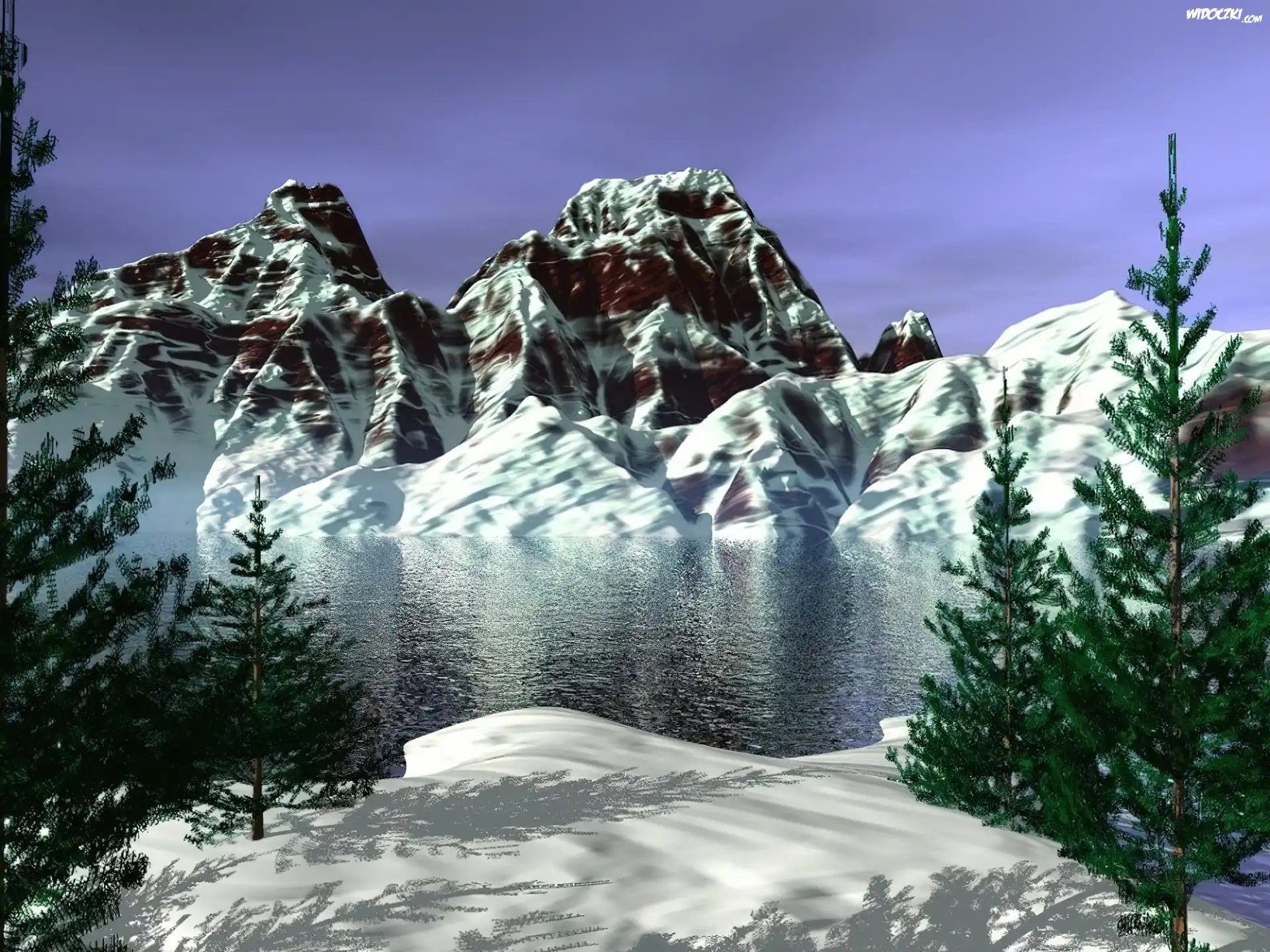 Zdjęcia, Góry,cztery choinki, śnieg , Zima