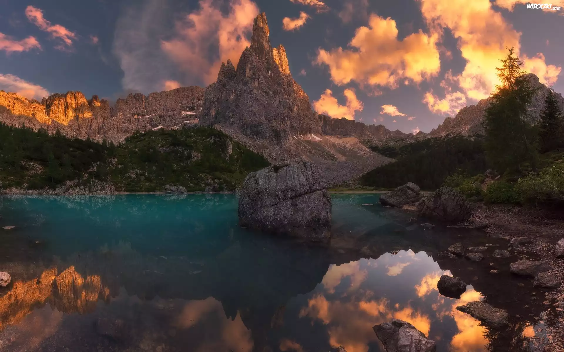 Góry, Dolomity, Masyw Sorapiss, Jezioro Sorapis, Skały, Drzewa, Lasy, Chmury, Prowincja Belluno, Włochy |
