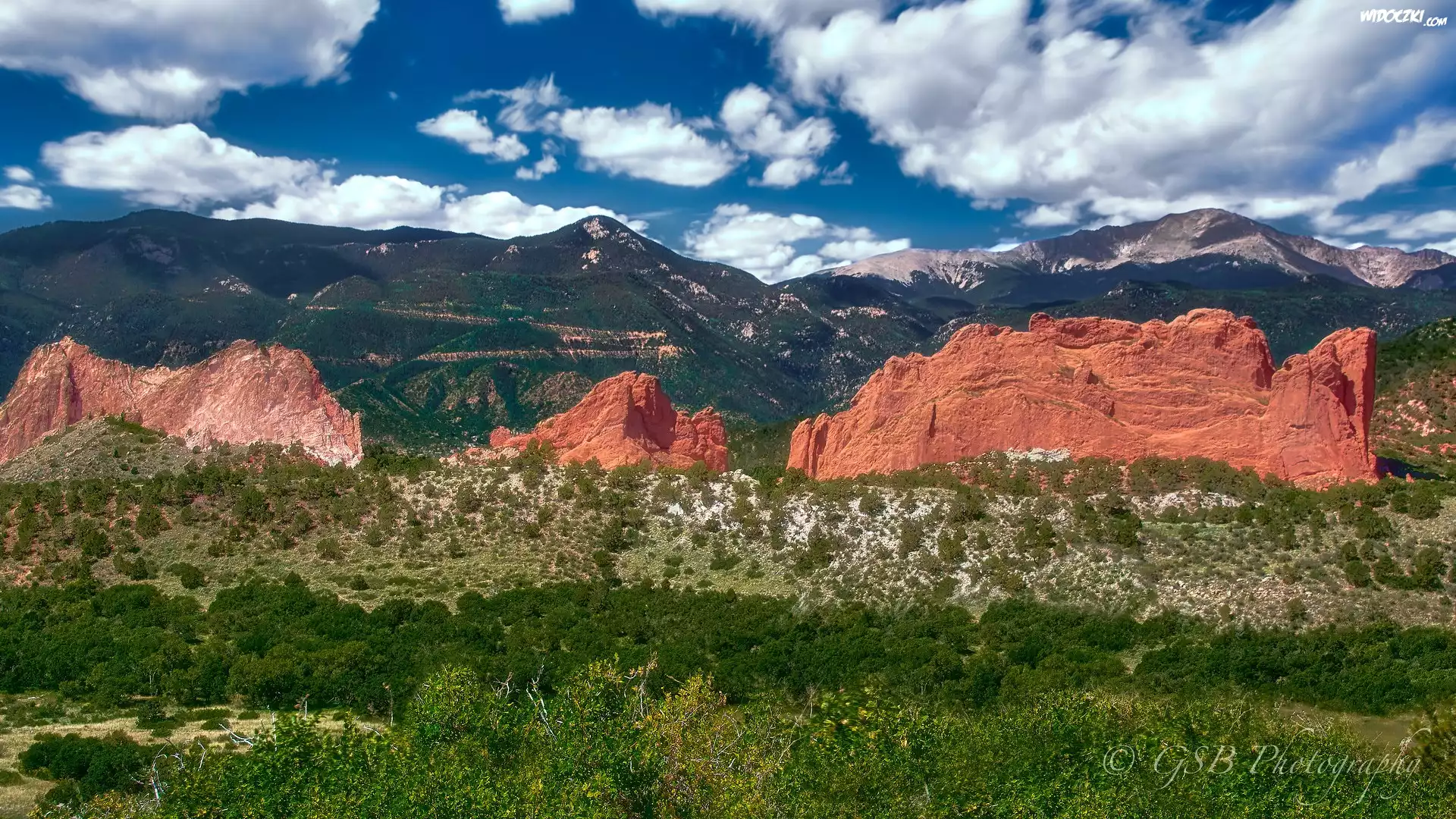 Góry Skaliste, Czerwone, Skały, Park stanowy, Garden of the Gods, Rośliny, Chmury, Colorado Springs, Kolorado |