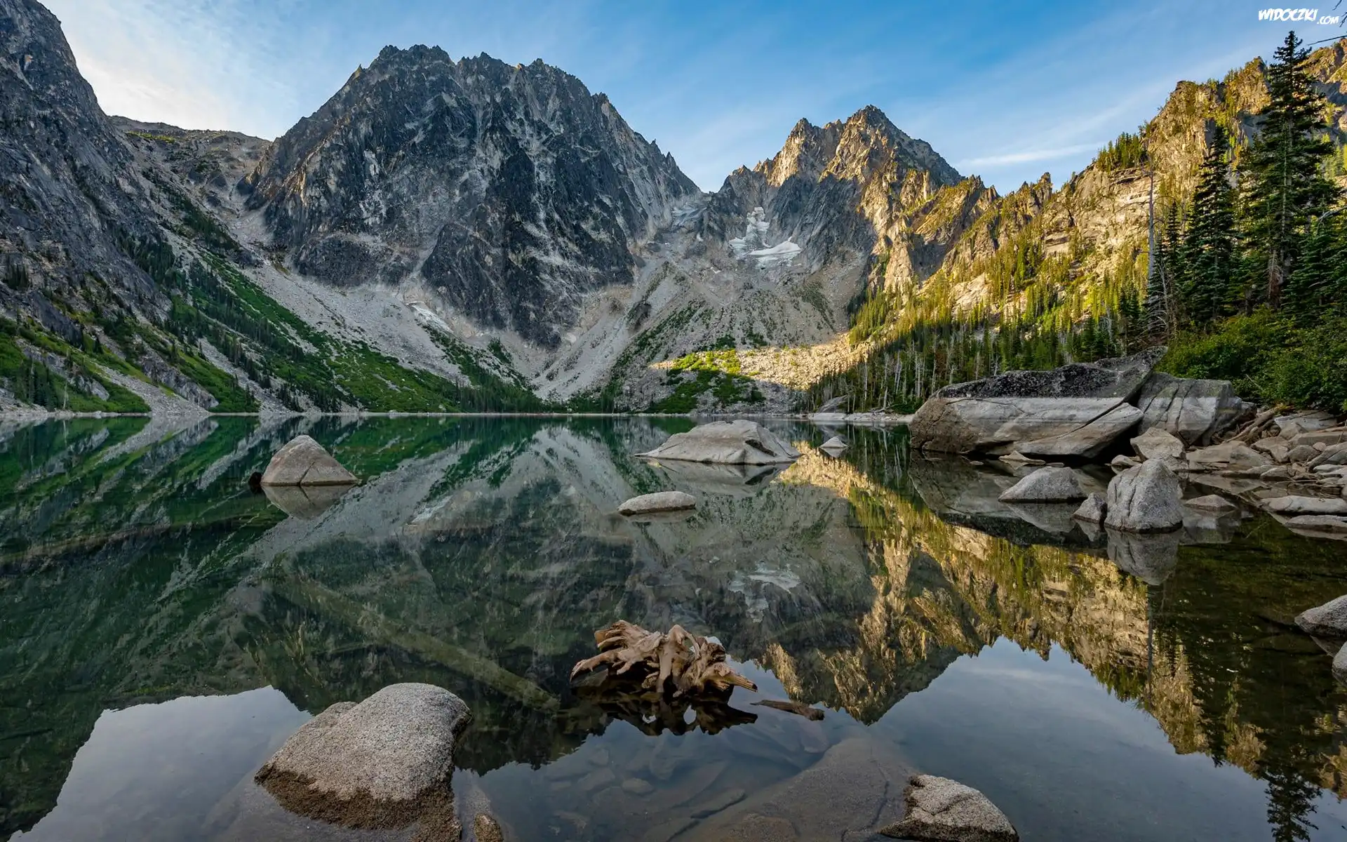 Góry, Jezioro, Colchuck Lake, Drzewa, Kamienie, Stan Waszyngton, Stany Zjednoczone