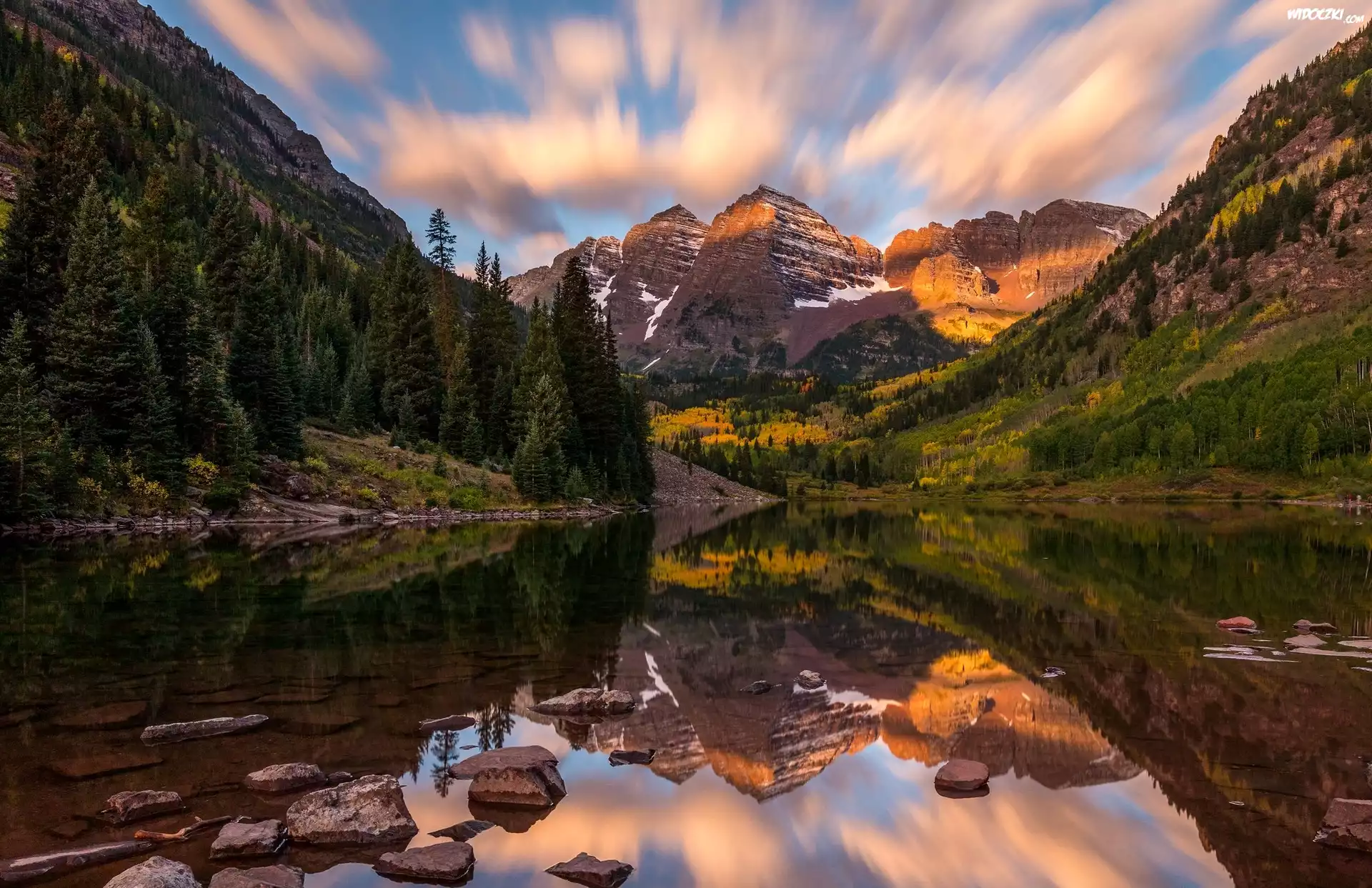 Stany Zjednoczone, Stan Kolorado, Góry Skaliste, Szczyty Maroon Bells, Jezioro Maroon Lake, Jesień, Drzewa |