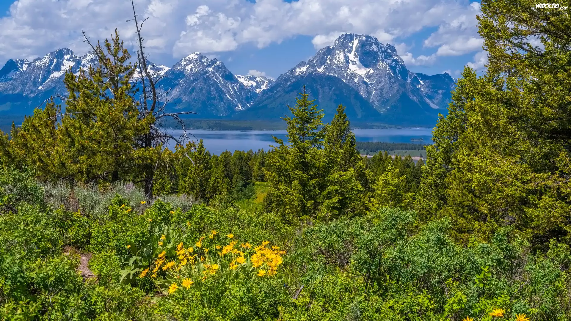 Zdjęcia, Góry, Drzewa, Kwiaty, Park Narodowy Grand Teton, Wyoming, Stany Zjednoczone
