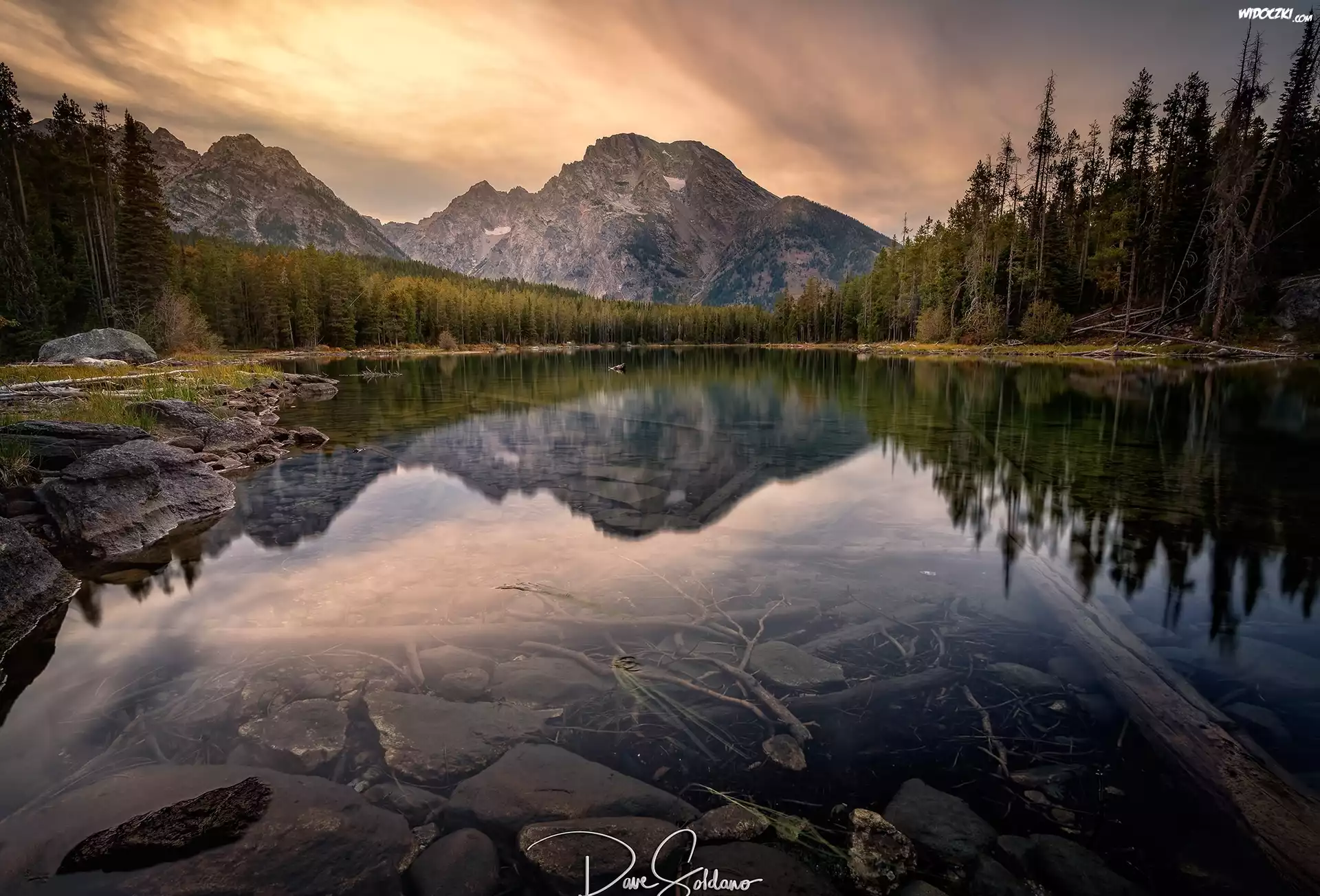 Góry, Szczyt Mount Moran, Las, Jezioro String Lake, Park Narodowy Grand Teton, Stan Wyoming, Stany Zjednoczone |