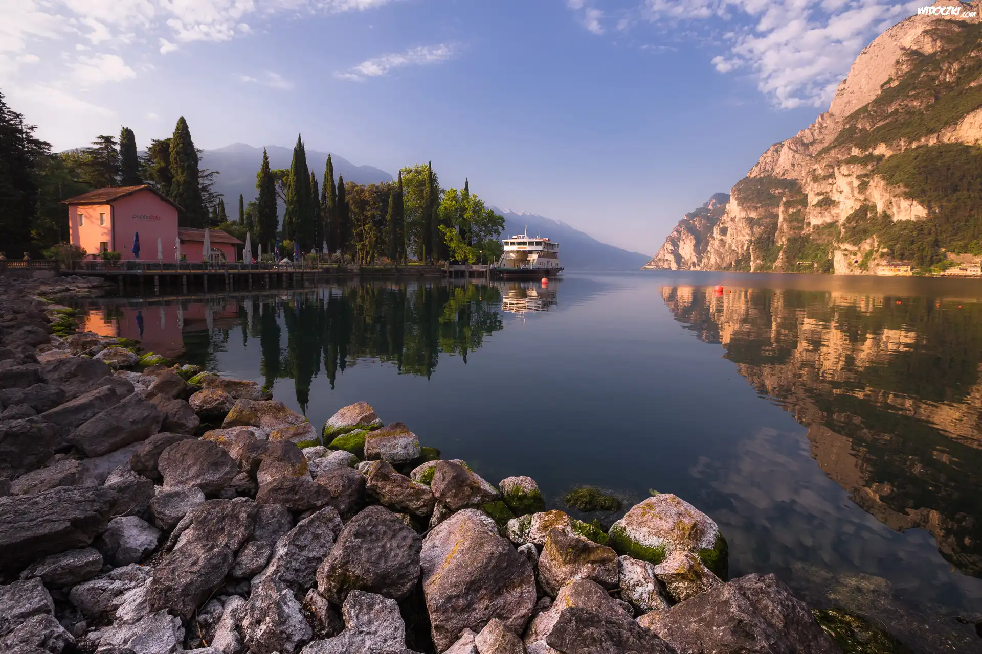 Zdjęcia, Jezioro Garda, Góry, Dom, Statek, Kamienie, Riva del Garda, Trento, Włochy