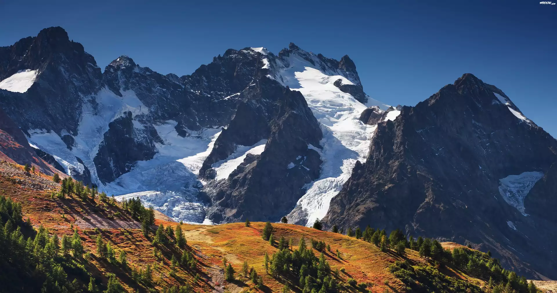 Zdjęcia, Góry, Ośnieżone szczyty, Drzewa