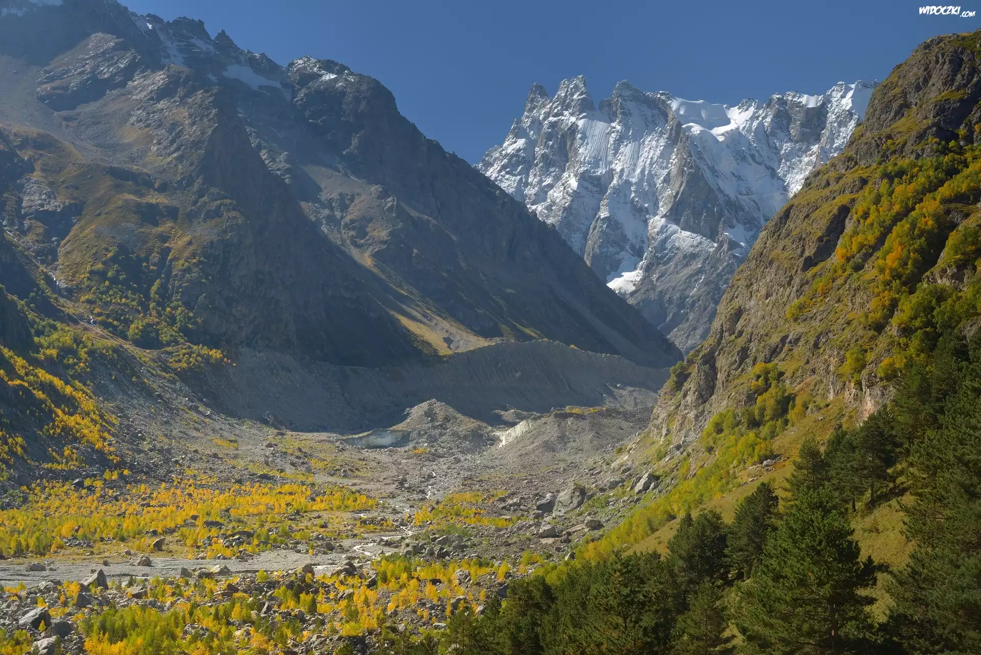 Góry, Drzewa, Ośnieżone, Szczyty, Dolina