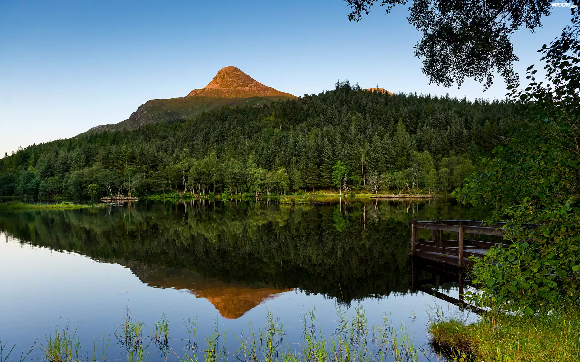 Zdjęcia, Szkocja, Góry, Jezioro, Las Glencoe Lochan, Pomost