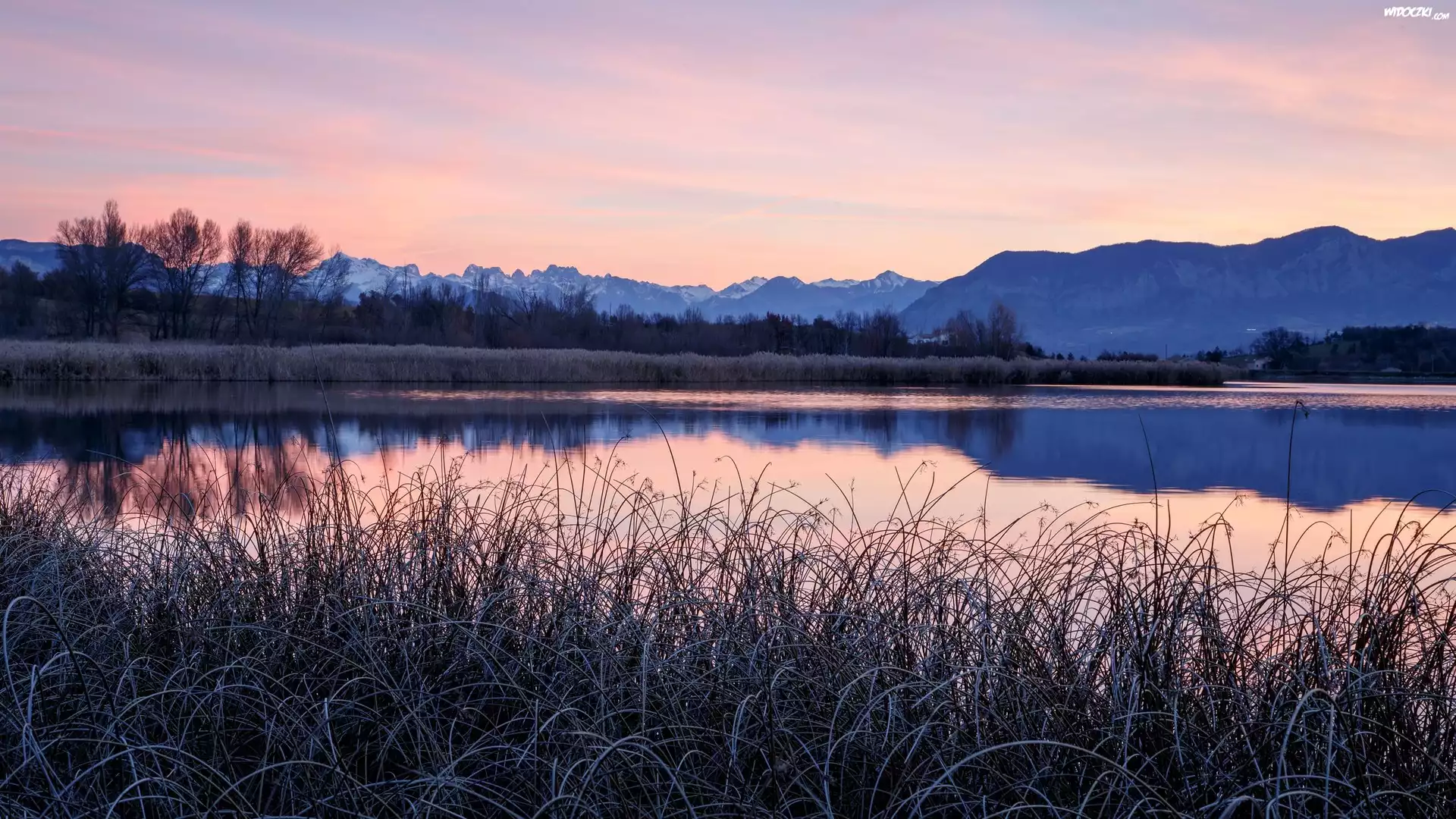 Góry, Drzewa, Trawa, Szuwary, Jezioro