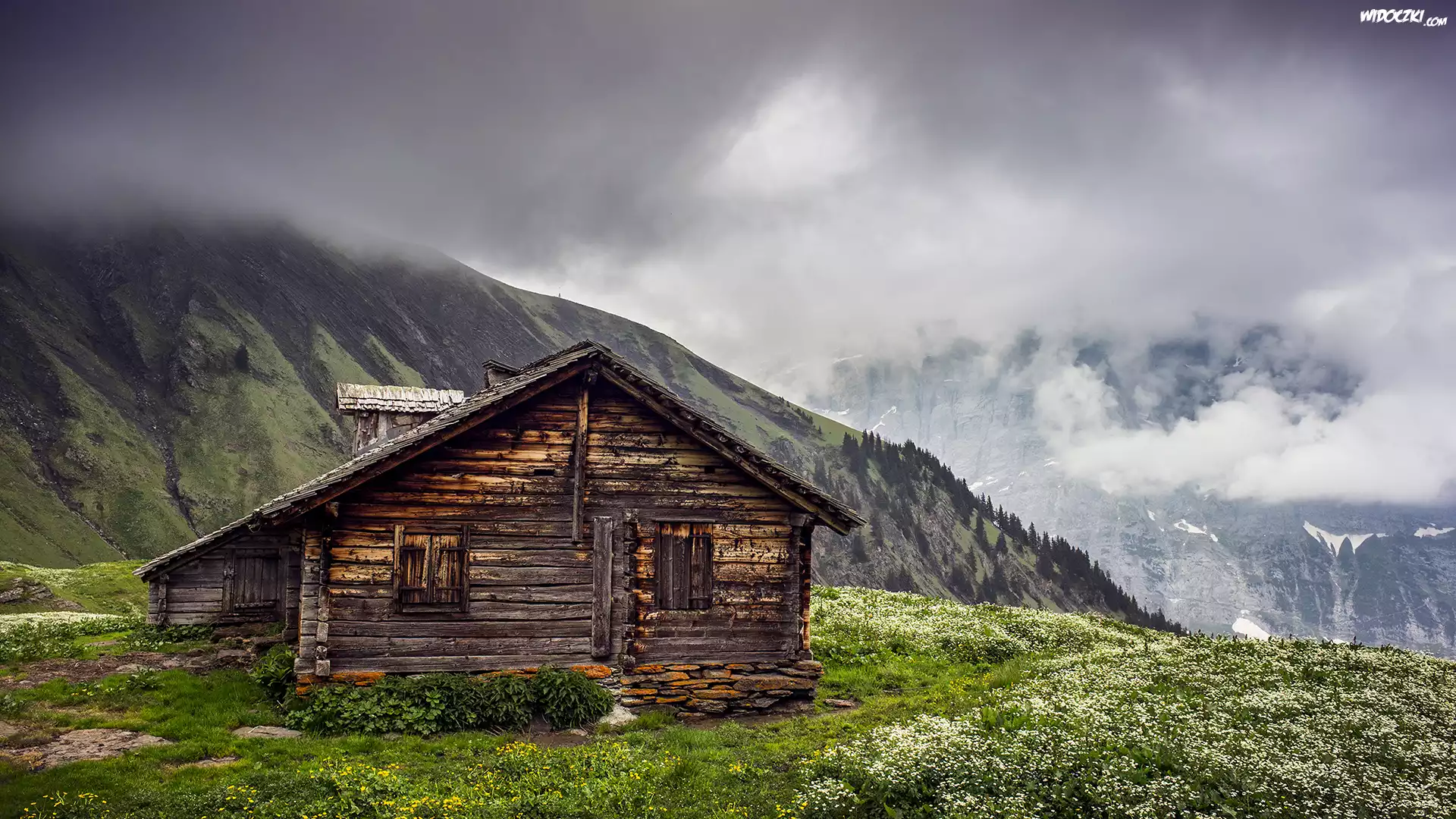 Szwajcaria, Wioska Grindelwald, Kanton Berno, Góry Alpy Berneńskie, Schronisko, Drewniany, Domek, Mgła |