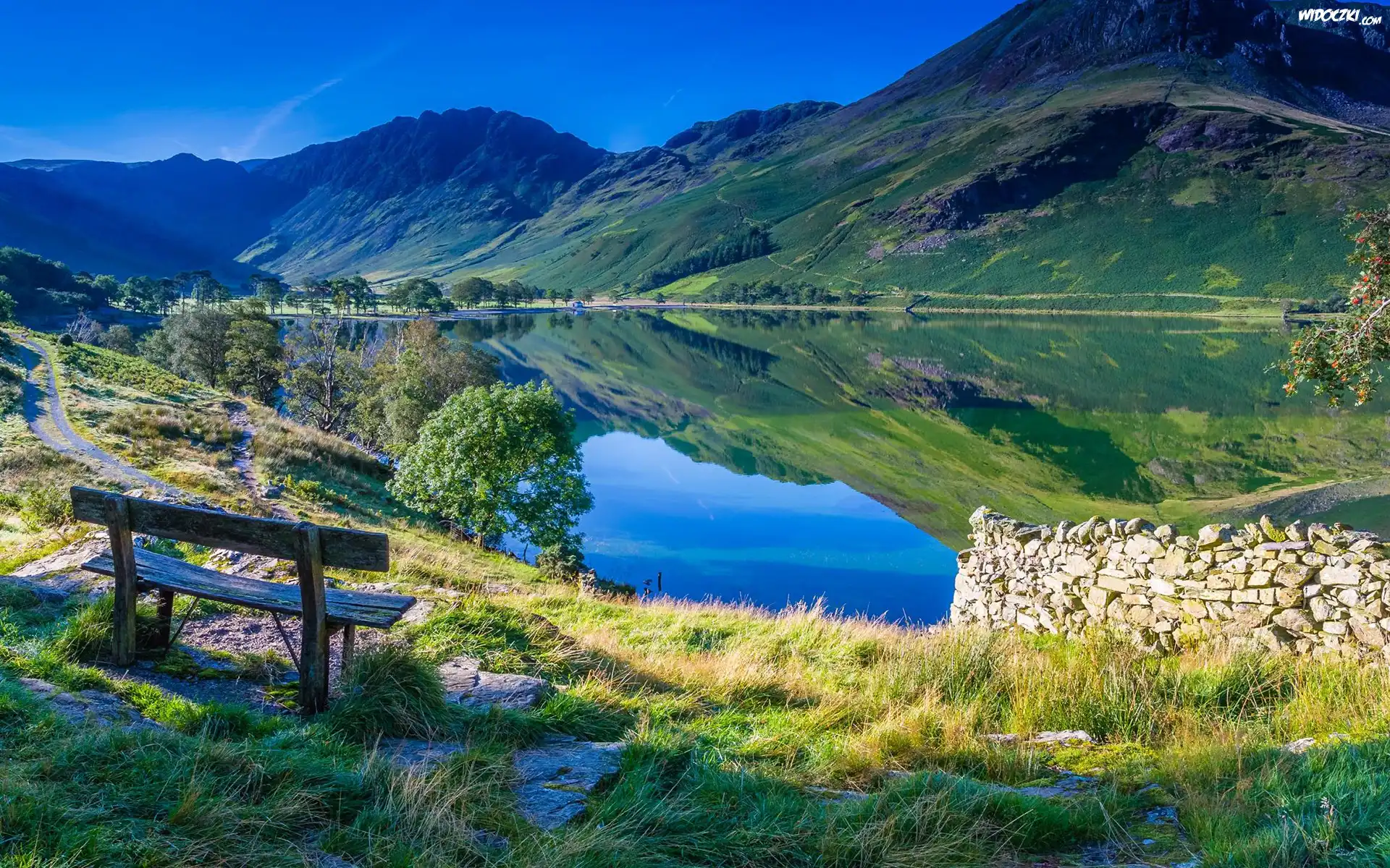 Zdjęcia, Góry, Staw Bowscale Tarn, Ławka, Kamienie, Ścieżka, Park Narodowy Lake District, Kumbria, Anglia