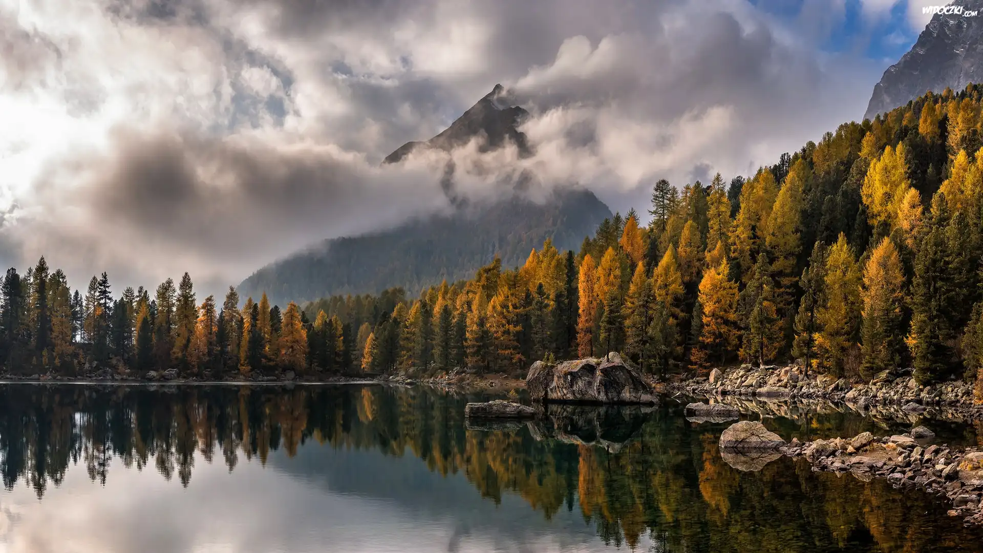 Góry, Jezioro Lago di Saoseo, Dolina Valle di Campo, Las, Skały, Chmury, Kanton Ticino, Szwajcaria |