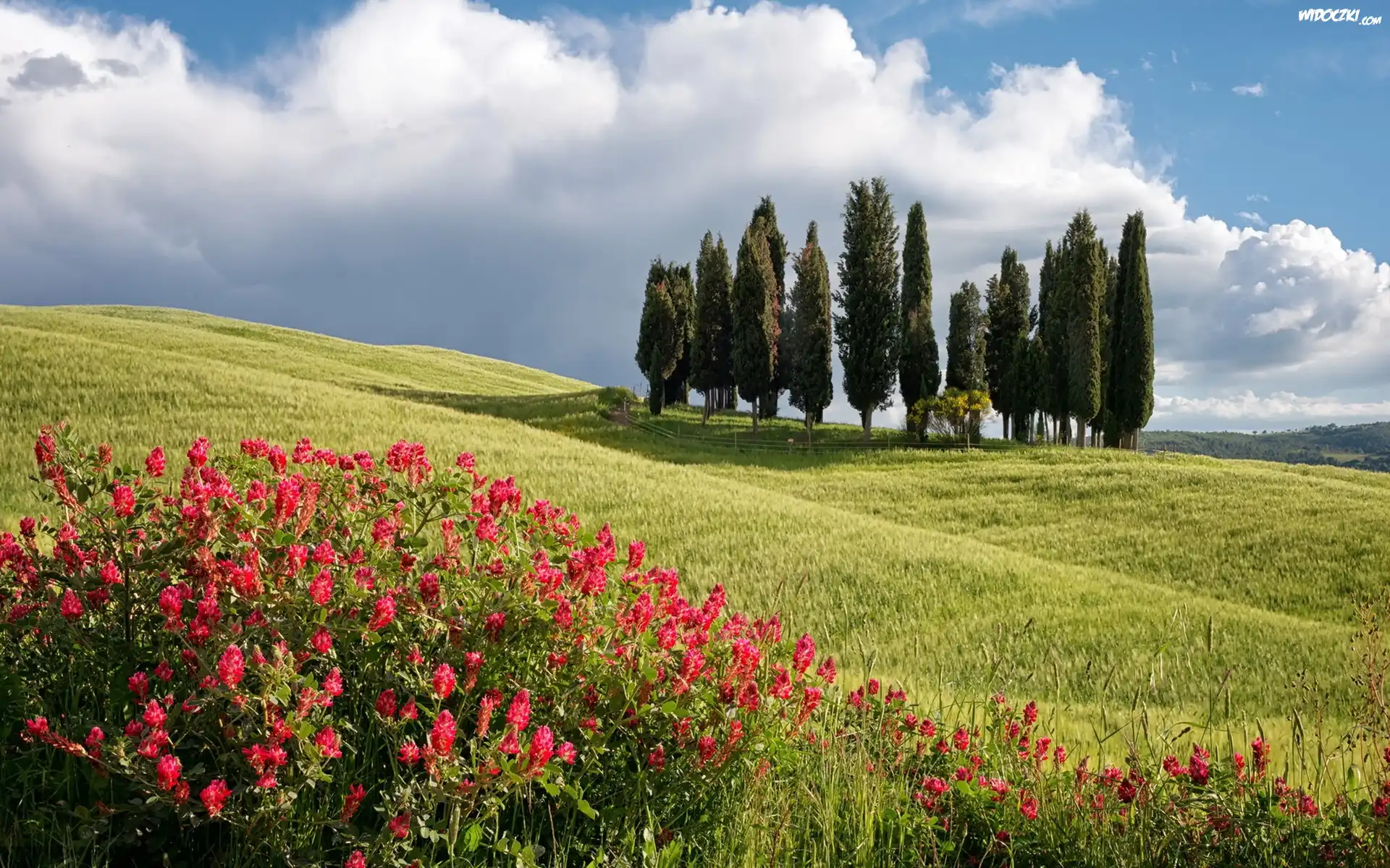 Zdjęcia, Góry, Łąki, Kwiaty, Drzewa, Toskania, Włochy