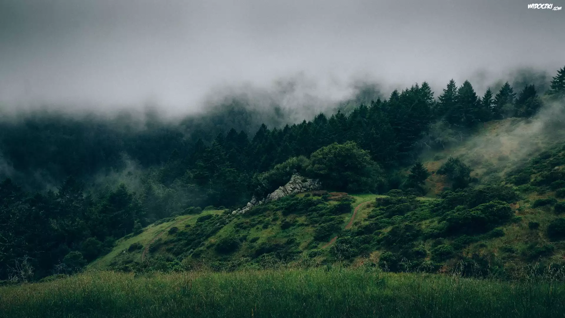 Zdjęcia, Góry, Drzewa, Trawa, Mgła