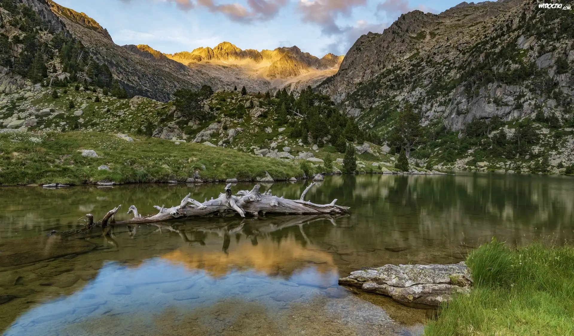 Jezioro, Góry, Rośliny, Suchy, Konar, Drzewa, Kamień, Trawa