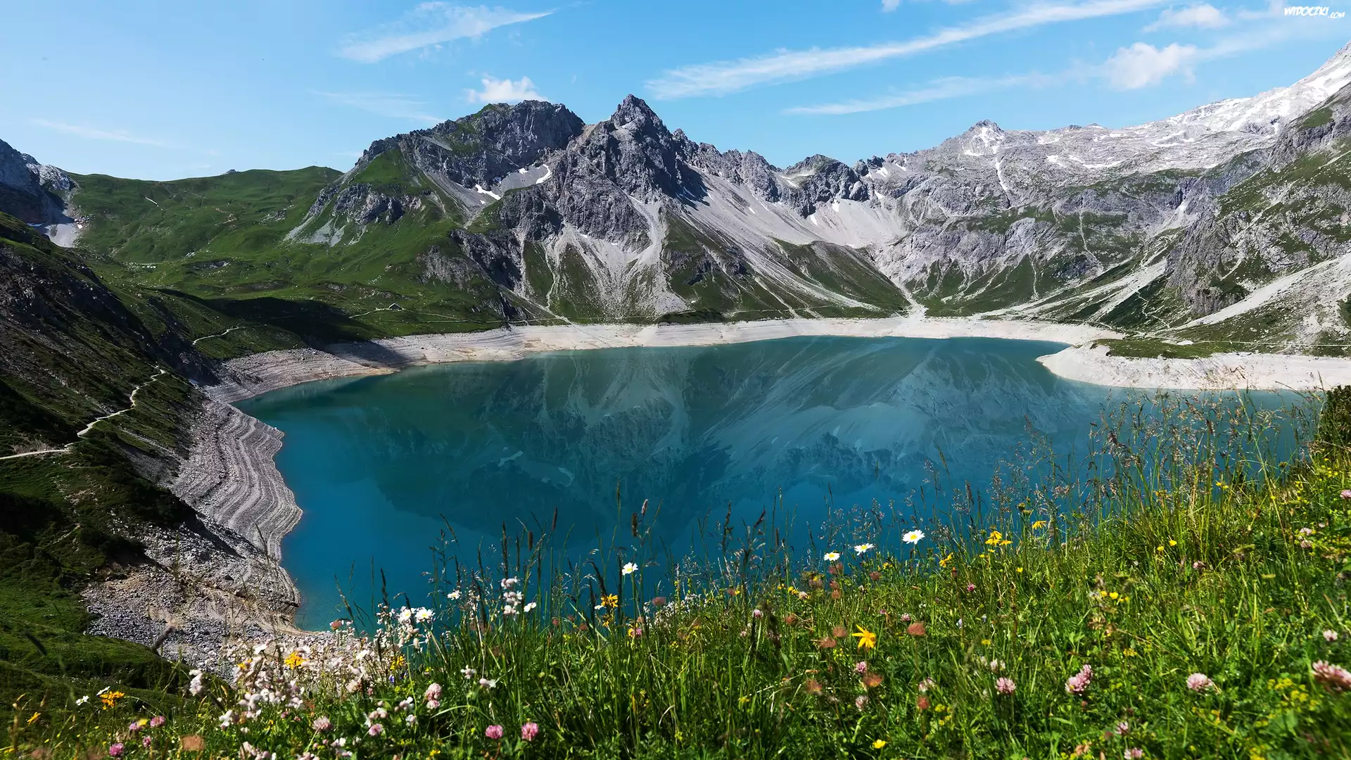 Zdjęcia, Góry, Jezioro, Trawa, Kwiaty