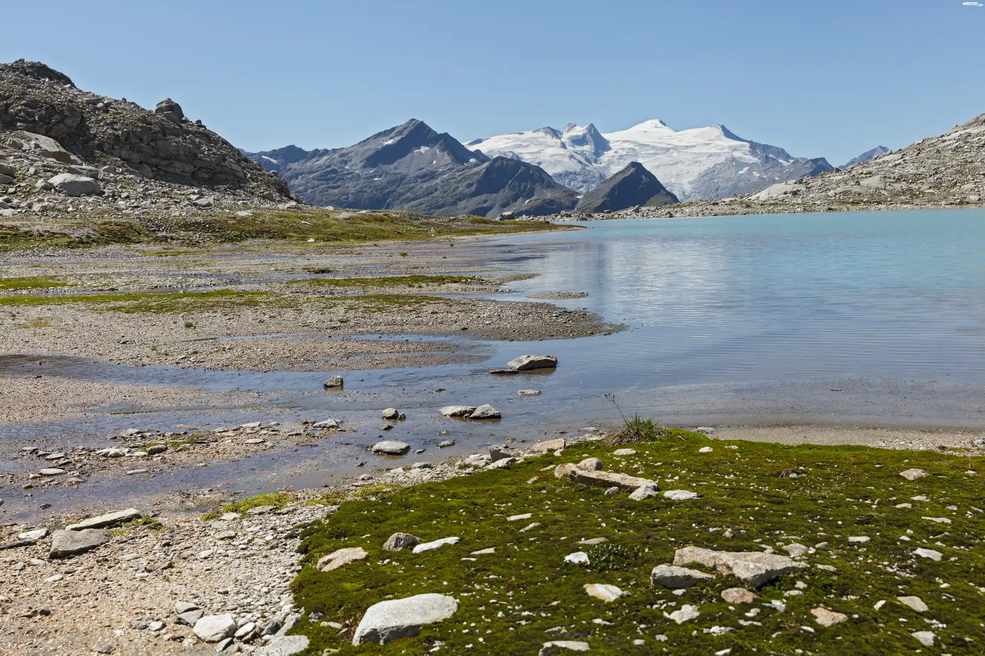 Góry, Jezioro, Kamienie, Trawa, Niebo