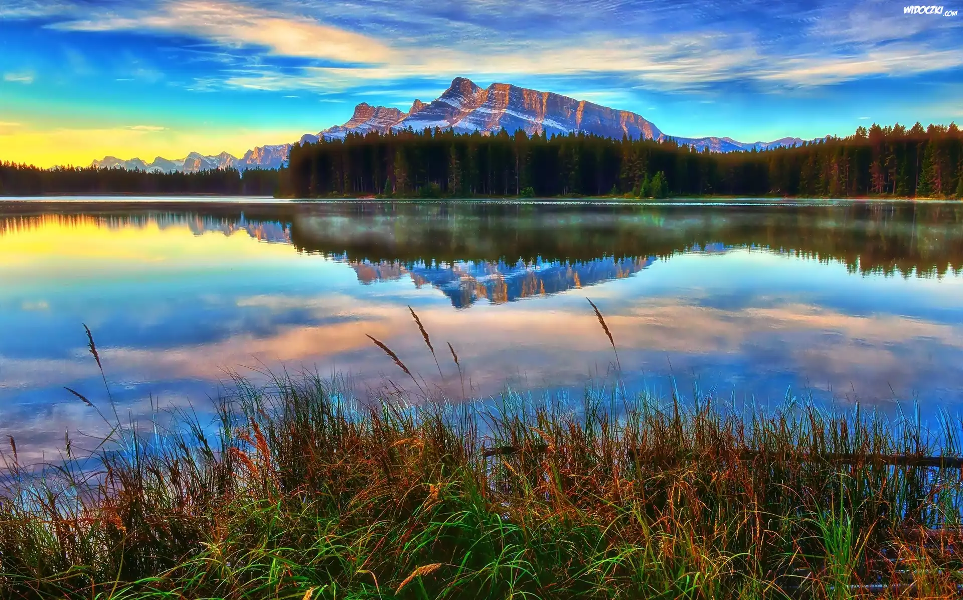Góry, Jezioro, Las, Trawa, Banff