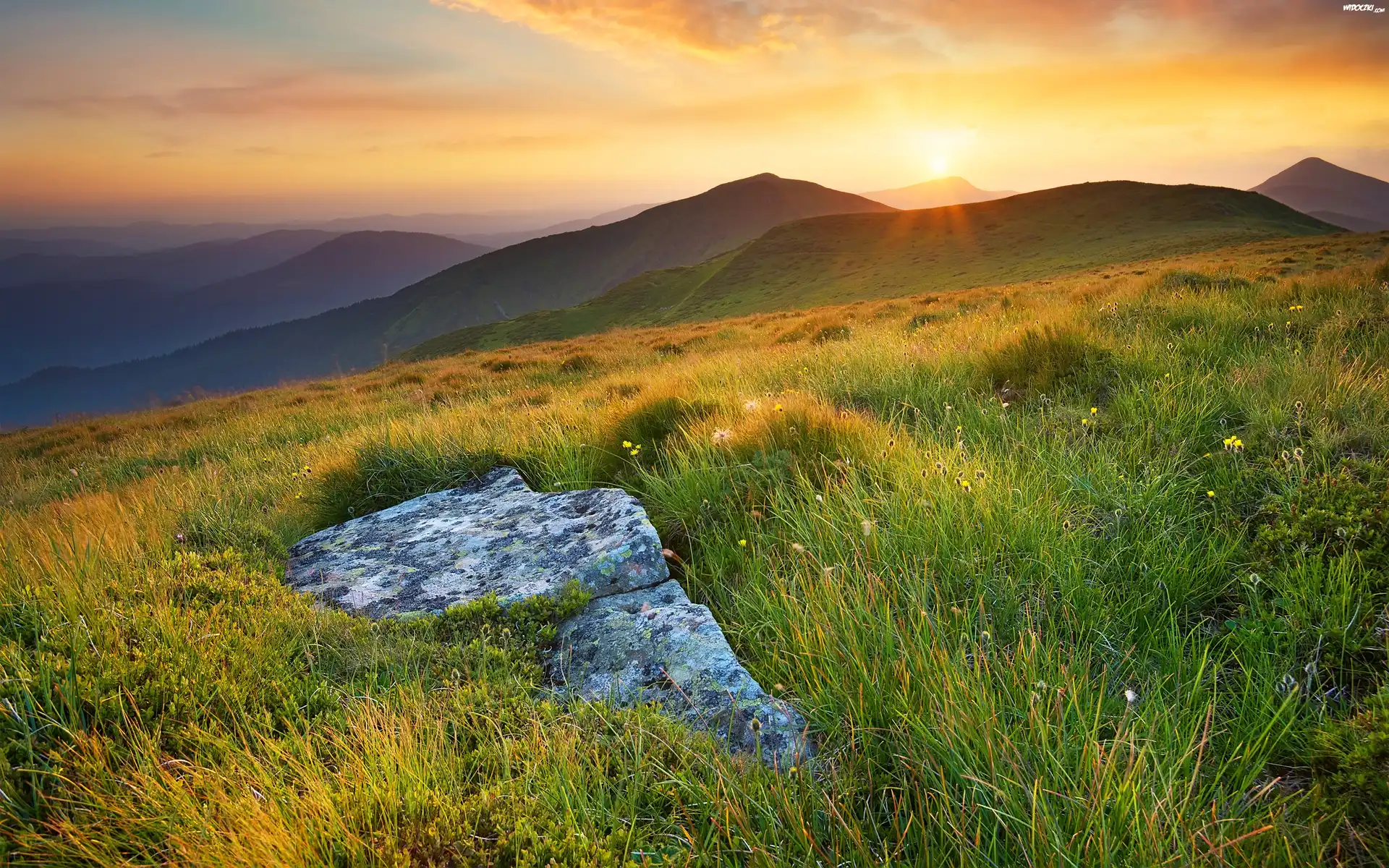 Zdjęcia, Góry, Zachód, Słońca, Trawa, Kamienie