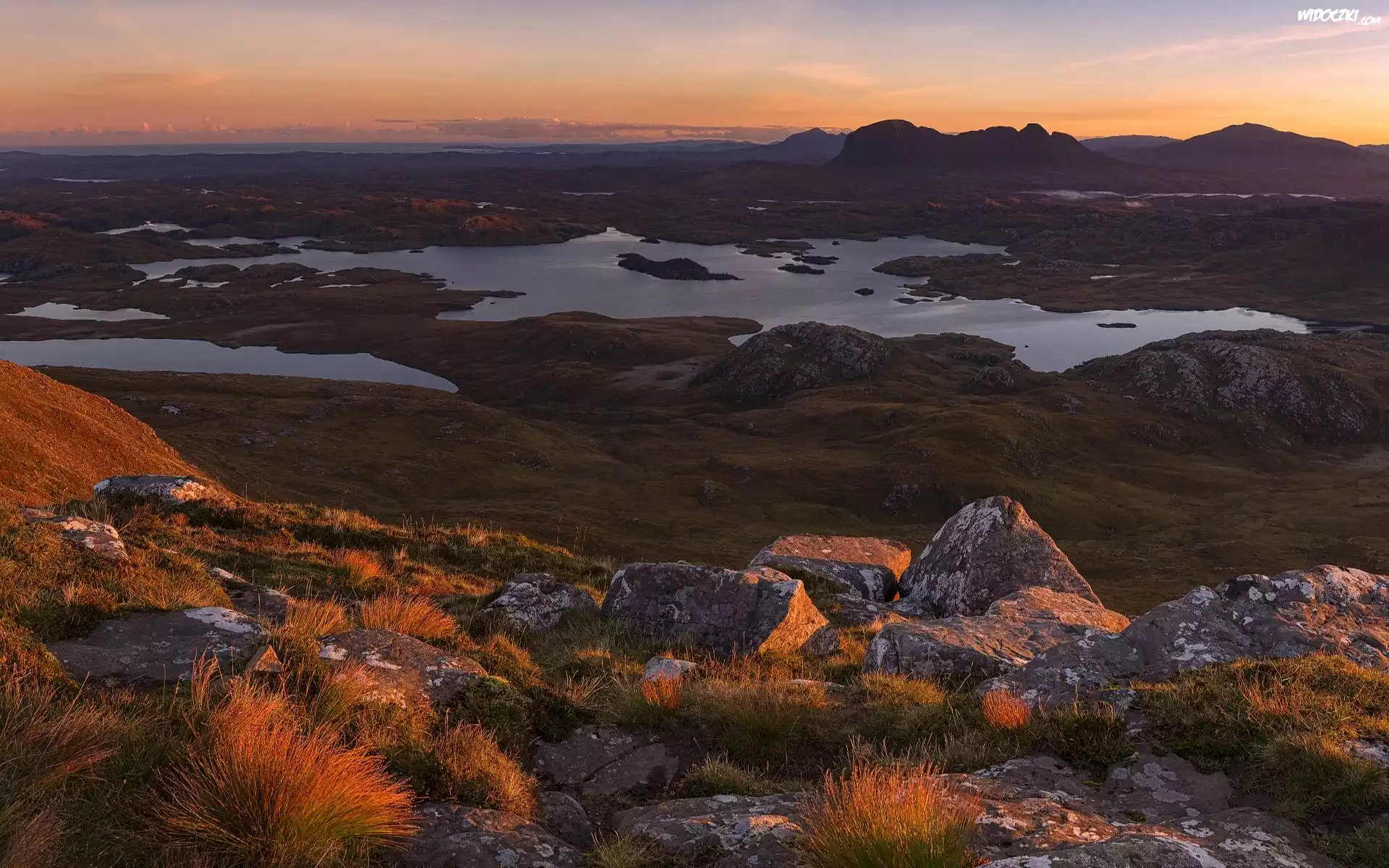 Zdjęcia, Szkocja, Góry Kaledońskie, Jezioro Loch Sionascaig, Kamienie, Trawa