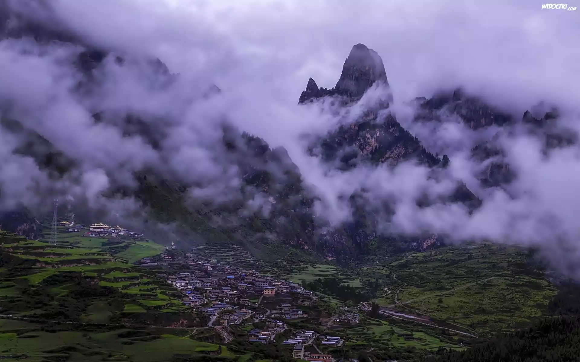 Zdjęcia, Góry, Chmury, Miasteczko, Tybet, Chiny