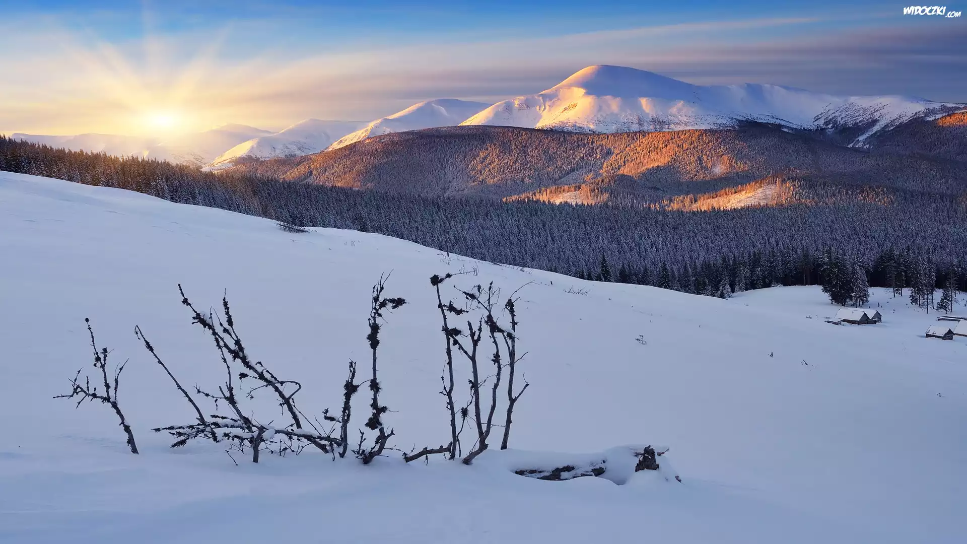 Zdjęcia, Ukraina, Góry Karpaty, Las, Zima, Wschód słońca