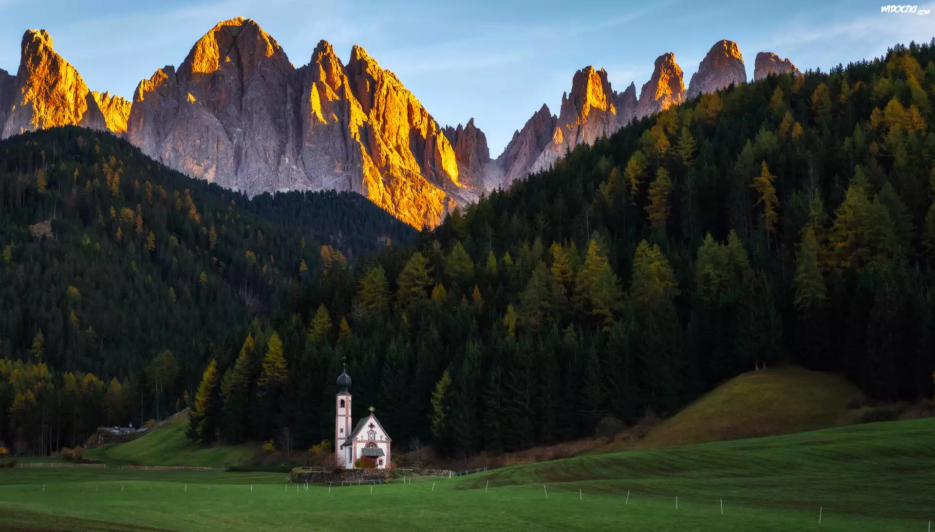 Zdjęcia, Kościół, Las, Góry, Dolina Val di Funes, Góry, Dolomity, Villnoss, Włochy