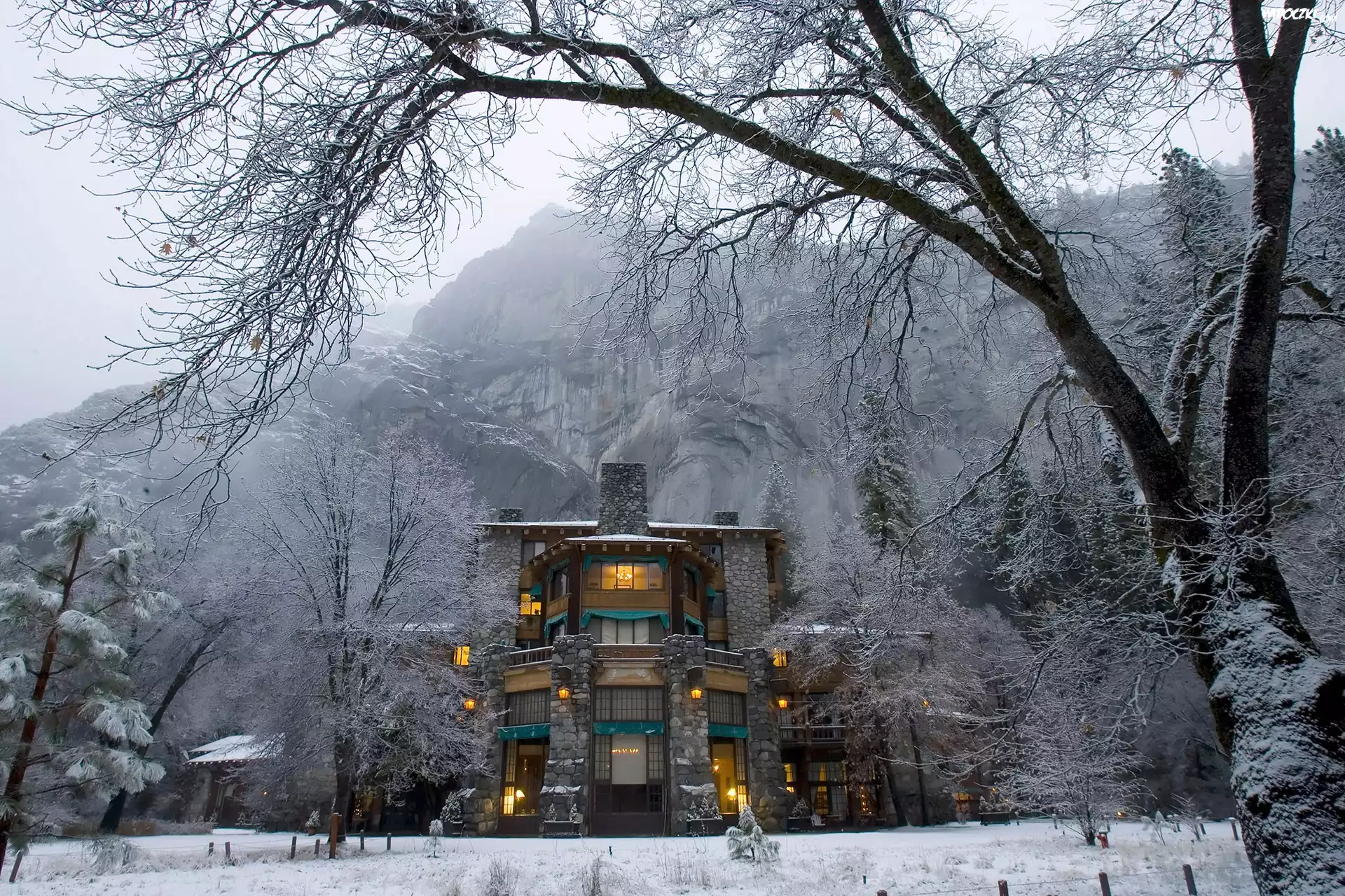 Góry ,Zima, Dom,Śnieg,Światło, Drzewa