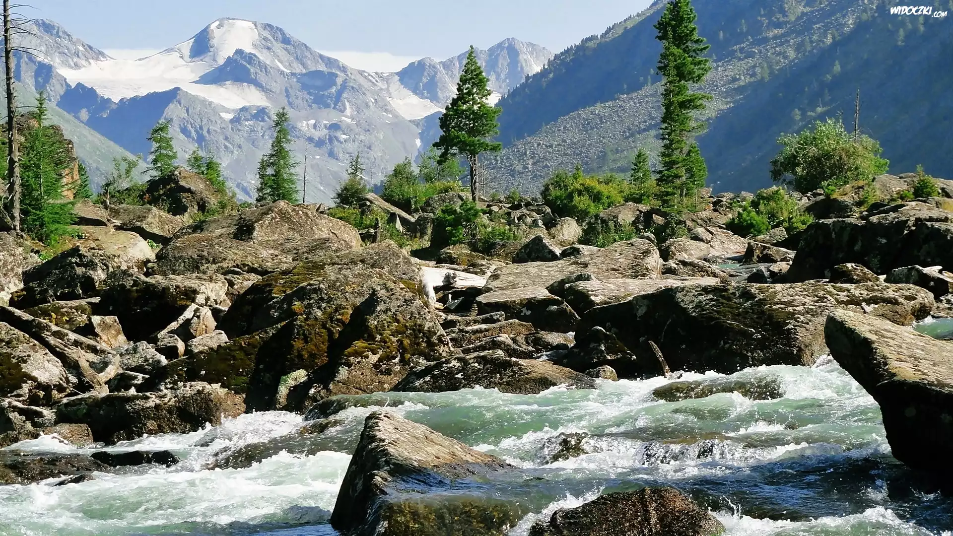 Góry, Głazy, Potok, Drzewa, Światło, Cień